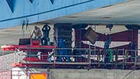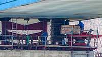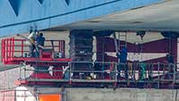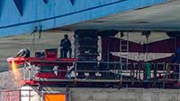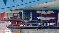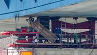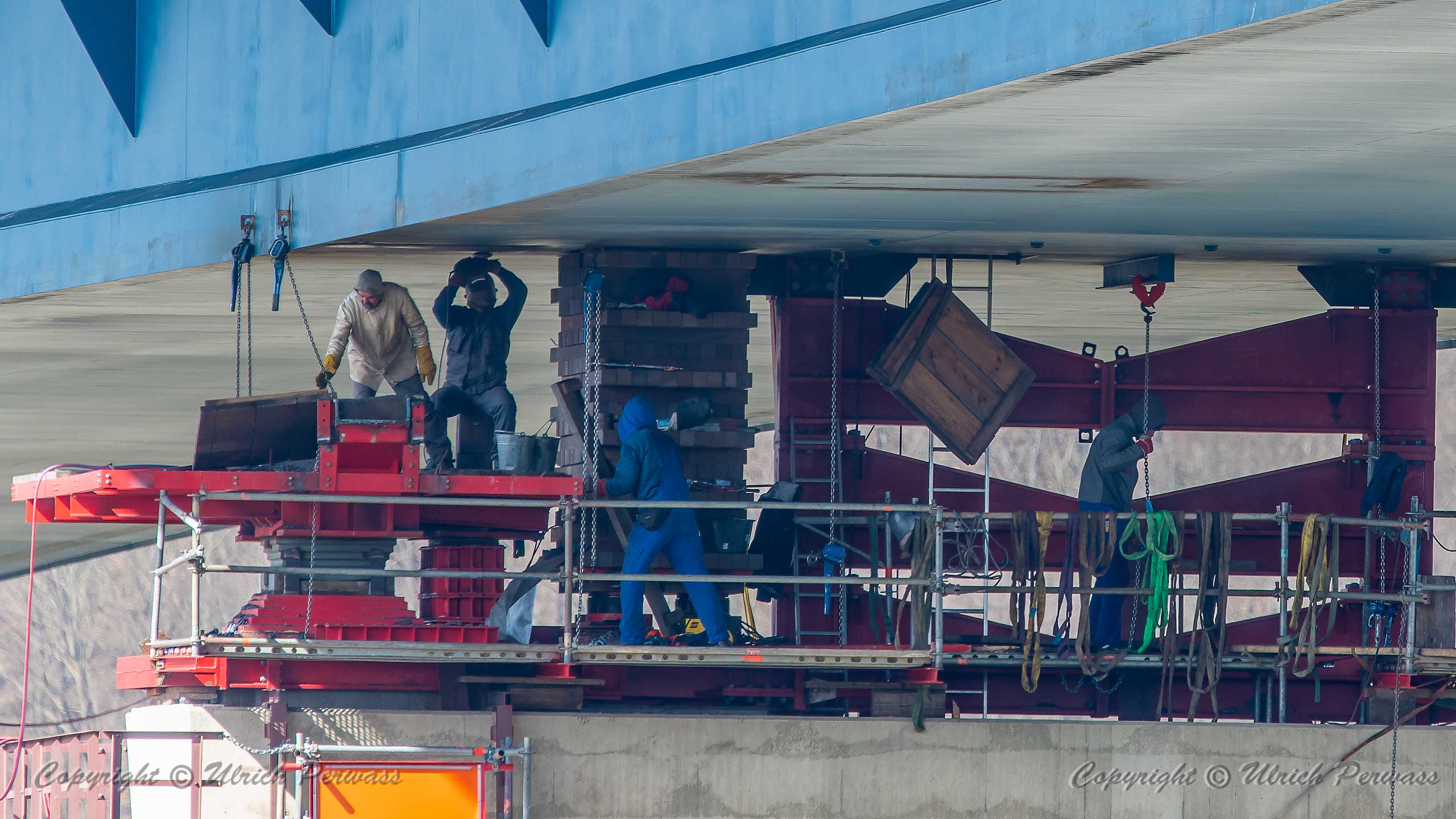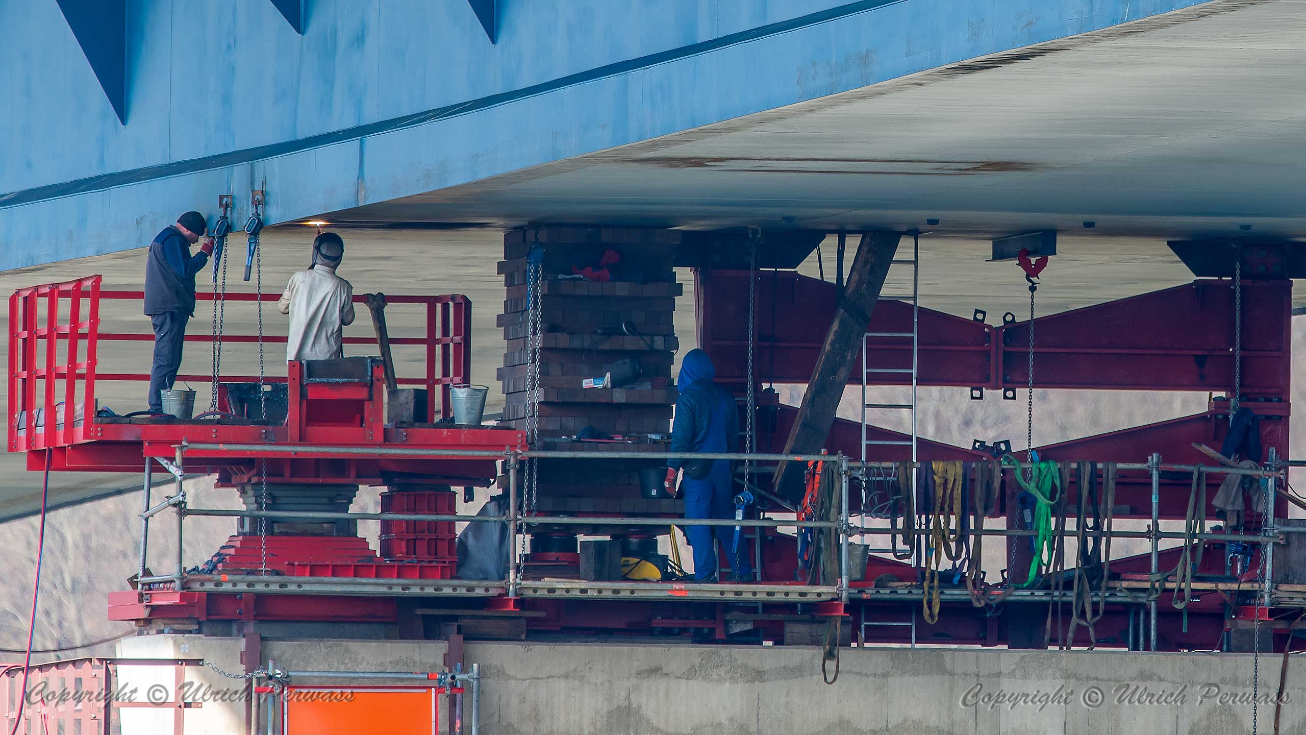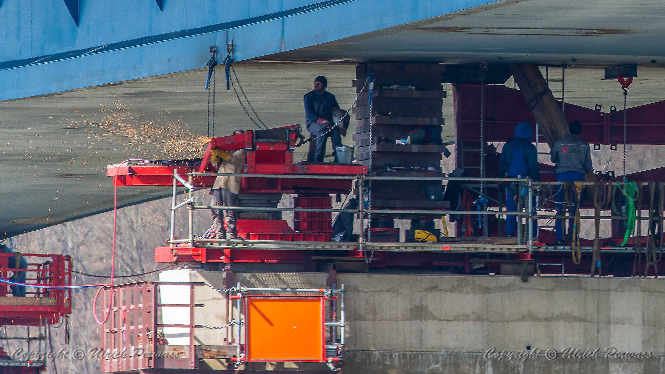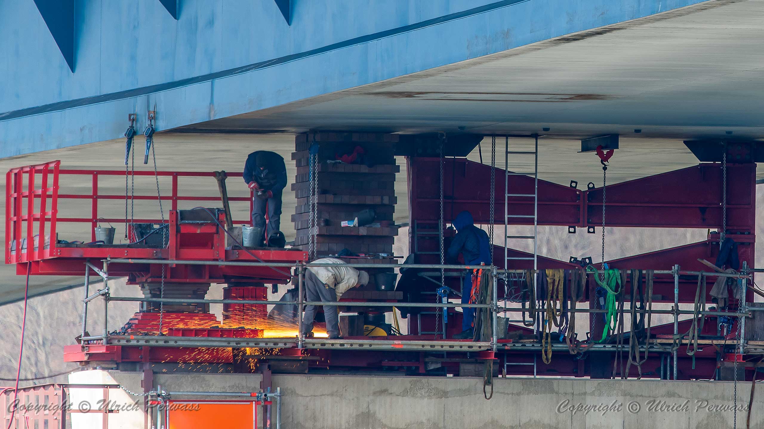 Am Freitag, den 22. März 2019, war ich bei gutem Wetter wieder an der Mosel, um das Absenken des Überbaus am Pfeiler 8 zu fotografieren. Leider waren die Stahlarbeiter noch nicht ganz so weit. Sie zerteilten immer noch die Überreste des Vorschubbalkens in transportierbare Stücke, die daraufhin durch ein Loch hoch in den Brückenkasten gehoben werden mussten, um dort dann abtransportiert zu werden. Eine Knochenarbeit! Alle Achtung! Doch schauen Sie selbst: