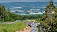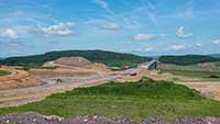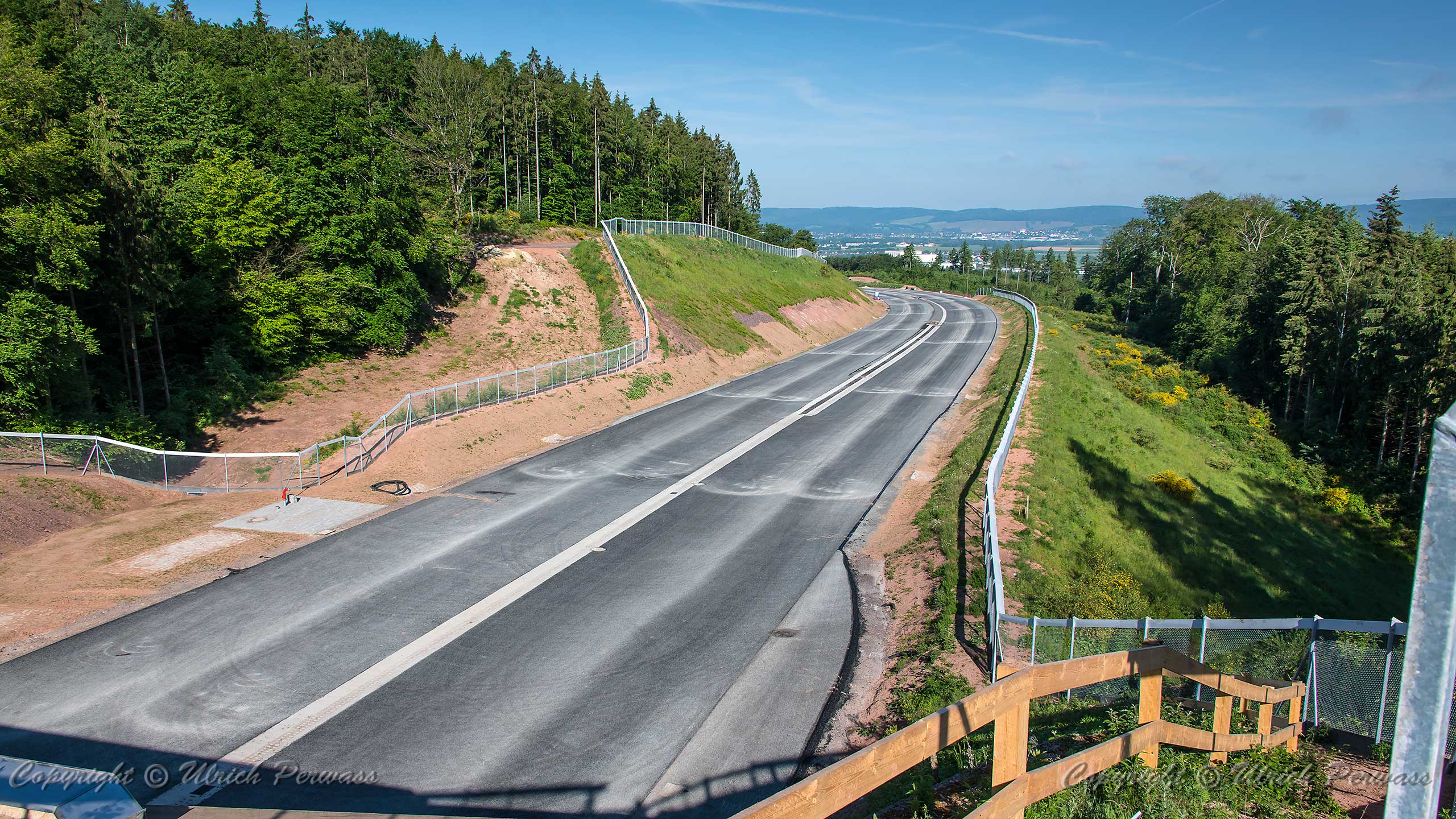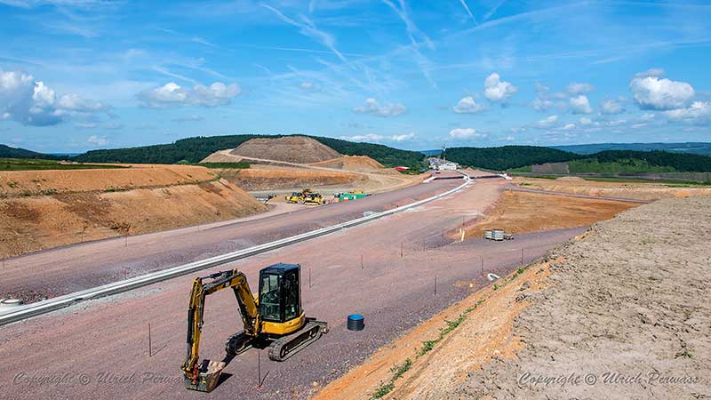 Übrigens erkannte ich am selben Tag noch den guten Grund für den Bau dieser schnellen Verkehrsader. Am Nachmittag besuchte ich die Hängeseilbrücke Geierlay bei Mörsdorf hoch oben im Hunsrück und gab für die Rückfahrt ins Navi Lösnich an der Mosel ein. Dieses NAVI leitete mich über die Hunsrückhöhenstraße gen Westen. Die Abfahrt nach Traben-Trarbach an die Mosel war überraschend gesperrt. Also weiter gen Westen, immer mit dem Ratschlag "Wenn möglich, bitte wenden!" Die Abfahrt nach Bernkastel-Kues war ebenfalls gesperrt. Also weiter gen Westen, schon wieder mit dem Ratschlag "Wenn möglich, bitte wenden!". Sie kennen sicherlich dieses nervtötende Spiel! Endlich eine vielversprechende Abfahrt an die Mosel bei Longkamp über die B50. B50? Na klar, hier kreuze ich die B50n, den neuen Zubringer zur Hochmoselbrücke. Der ist zwar noch nicht fertig, aber immerhin ein Hinweis! Also über die B50 runter an die Mosel, eine quälend lange, stauanfällige Serpentinenstraße nach Bernkastel-Kues! Wer von dort in die Eifel will, der muss auf der anderen Seite der Mosel auch wieder hoch, auch wieder über eine stauanfällige Serpentinenstraße! Es wird Zeit, dass die Hochmoselbrücke fertig wird! Hier unten nun die neue Zufahrt auf der Hunsrückseite: |