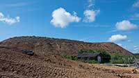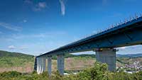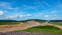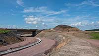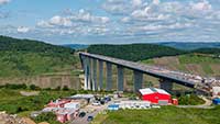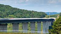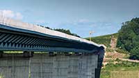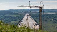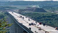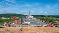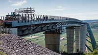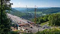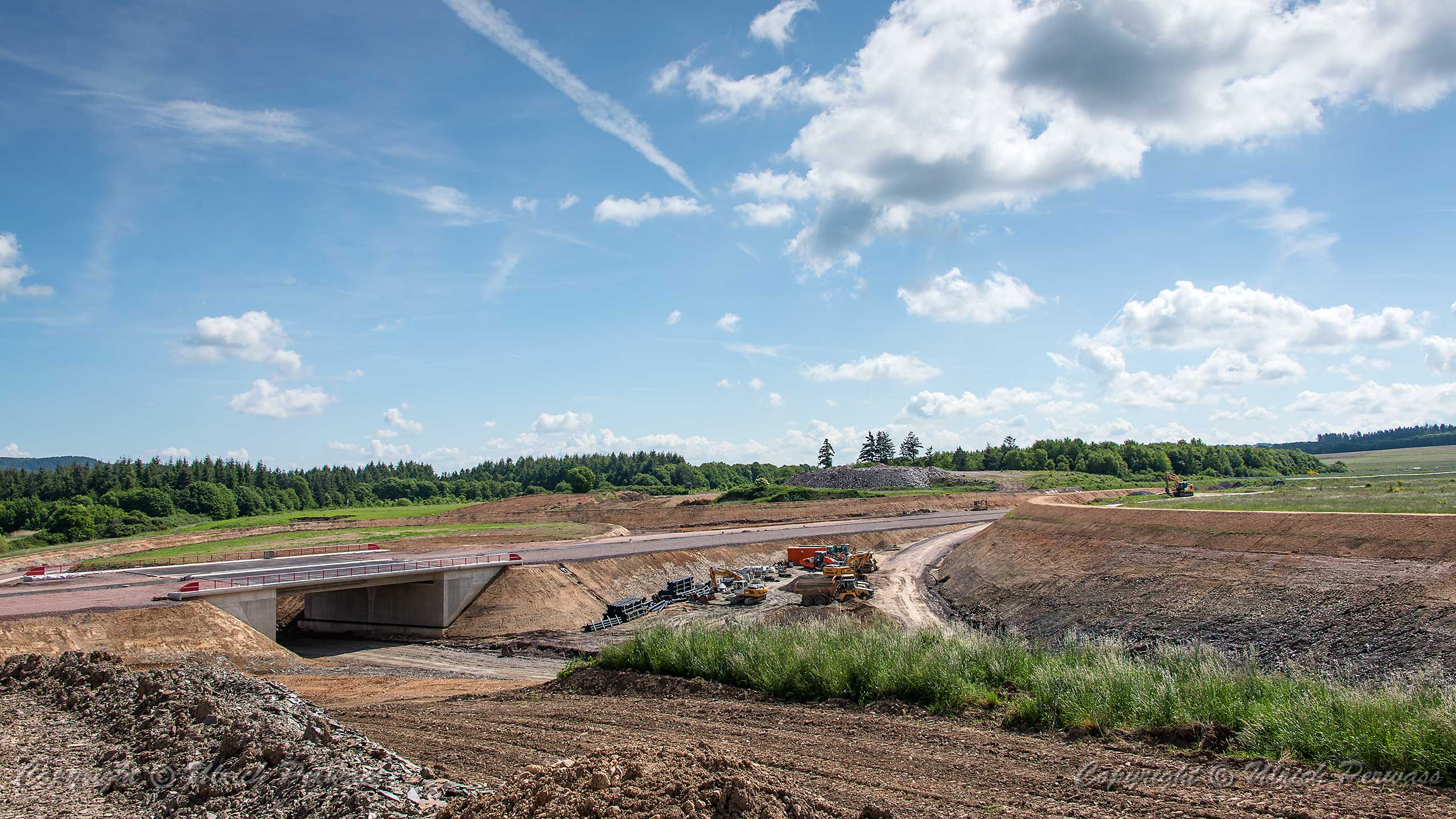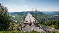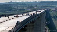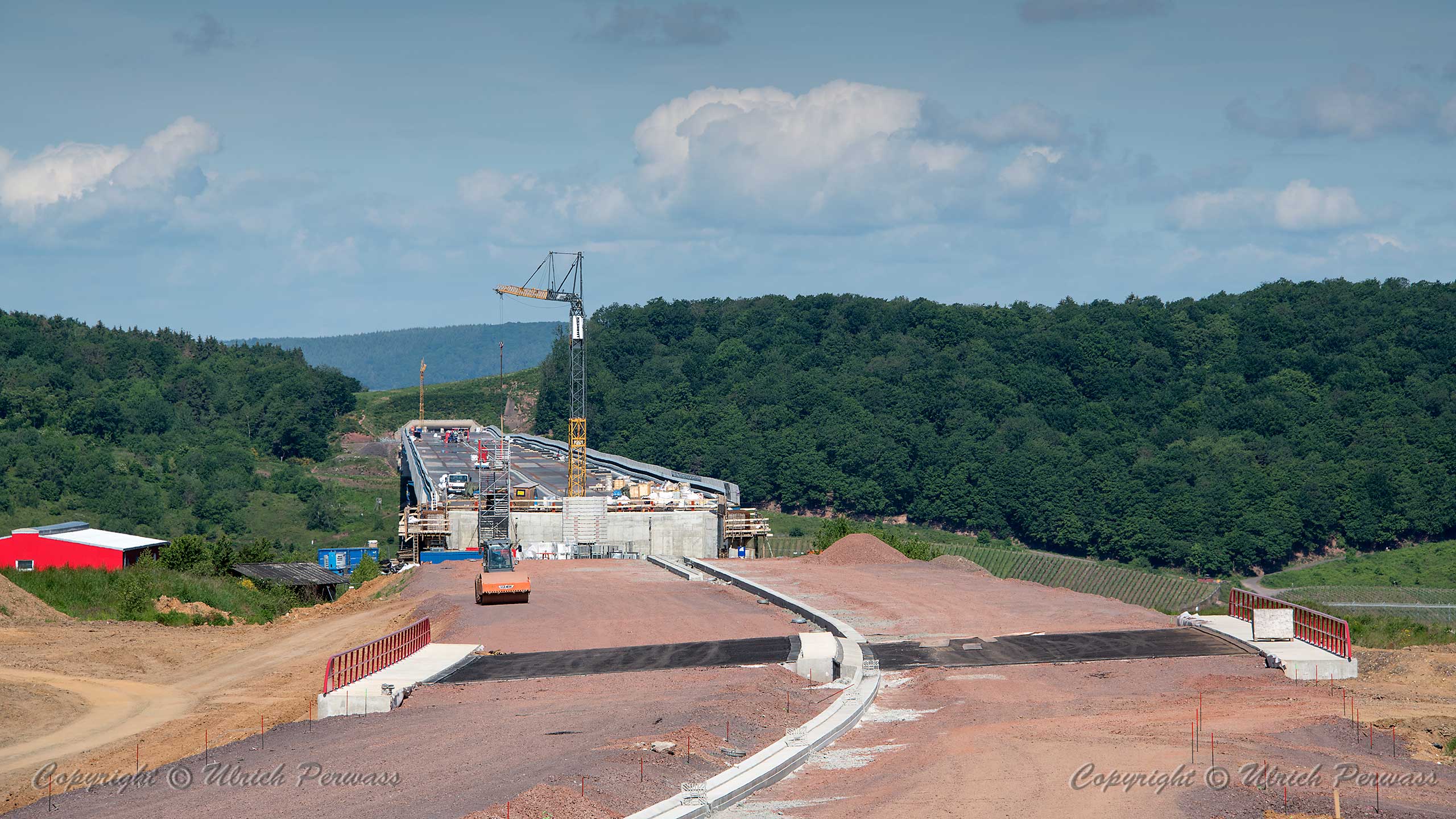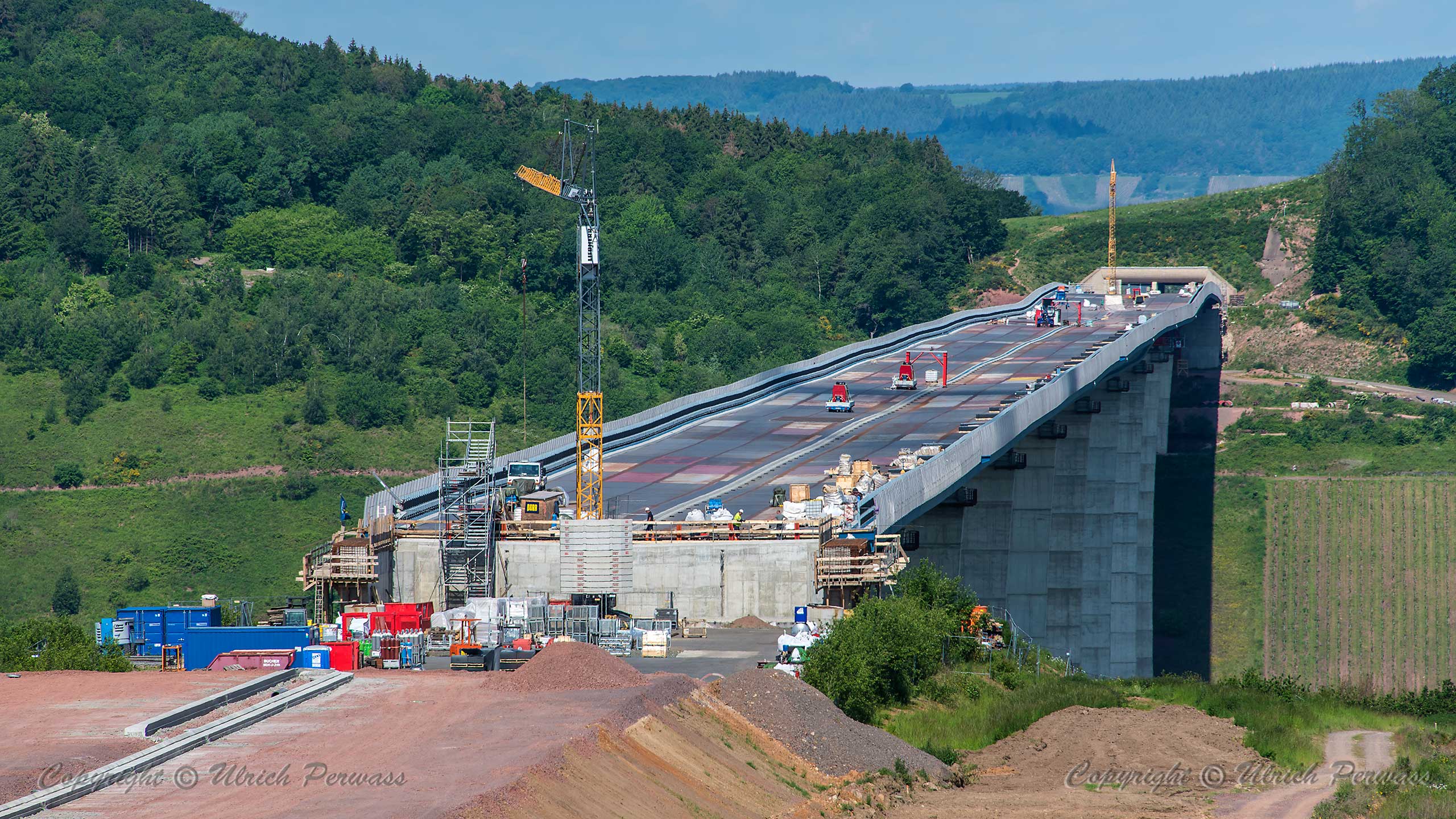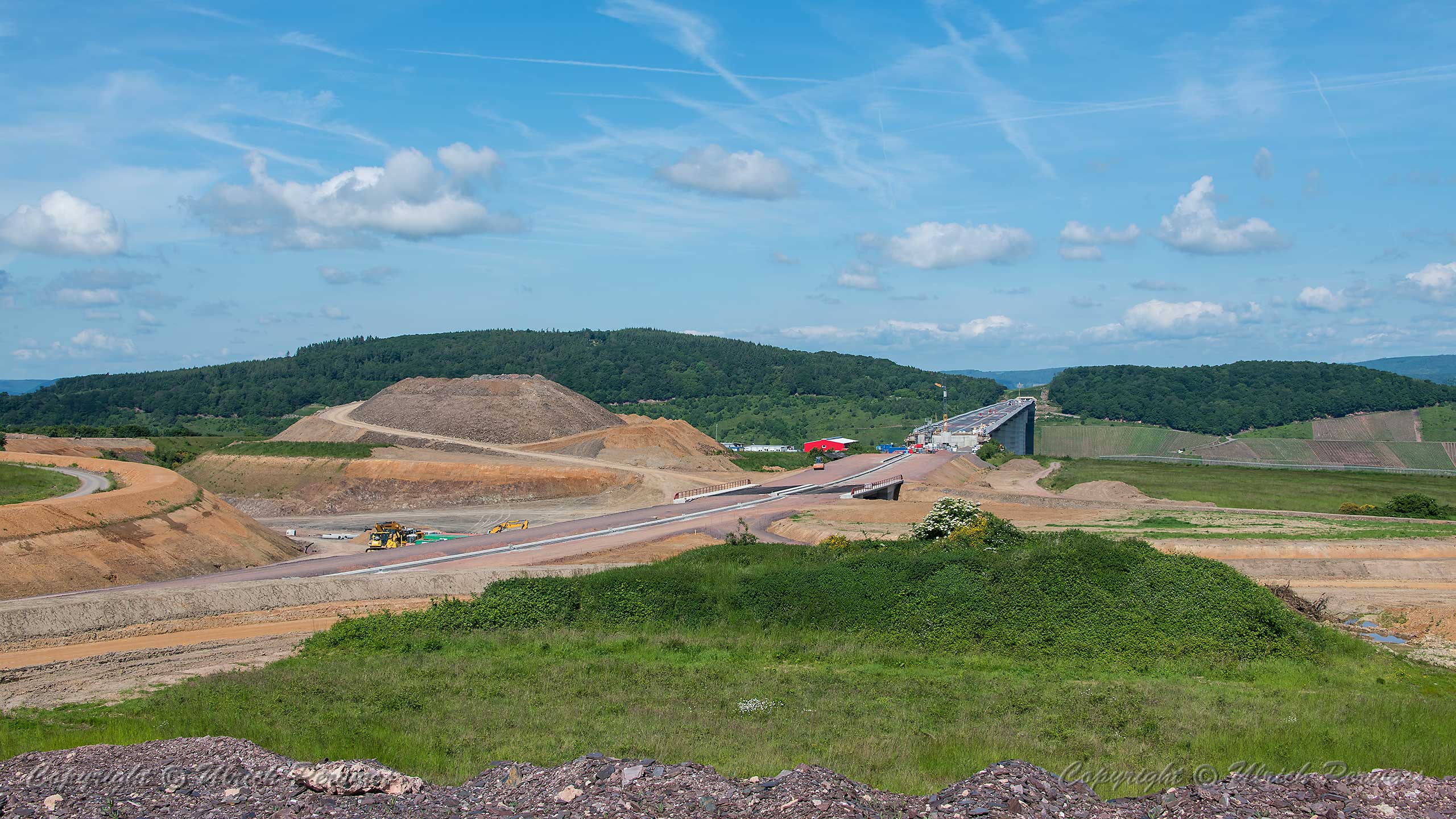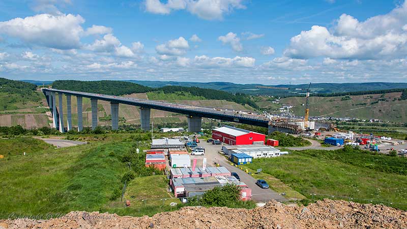 Hochmoselbrücke Ende Mai 2019 Endlich sollte Ende Mai 2019 nach langen wolkenverhangenen Wochen ein sonniges, angenehmes Sommerwetter mit viel Sonne das Wochenende verschönern. Das war für mich der Anlass, am Freitag, den 31. Mai mal wieder die Mosel zu besuchen und dort unter anderem auch die Hochmoselbrücke in Augenschein zu nehmen. Welch ein Fortschritt überraschte mich! Der Überbau war bis zu den Pfeilern 1 und 2 auf der Eifelseite um 2,40 Meter abgesenkt und glänzte in makelloser gerader Spannung bis zum Hunsrückwiderlager. Dort aber auf der Hunsrückseite prangte bereits hoch aufragend die frisch aufgeschüttete Aussichtsplattform: |