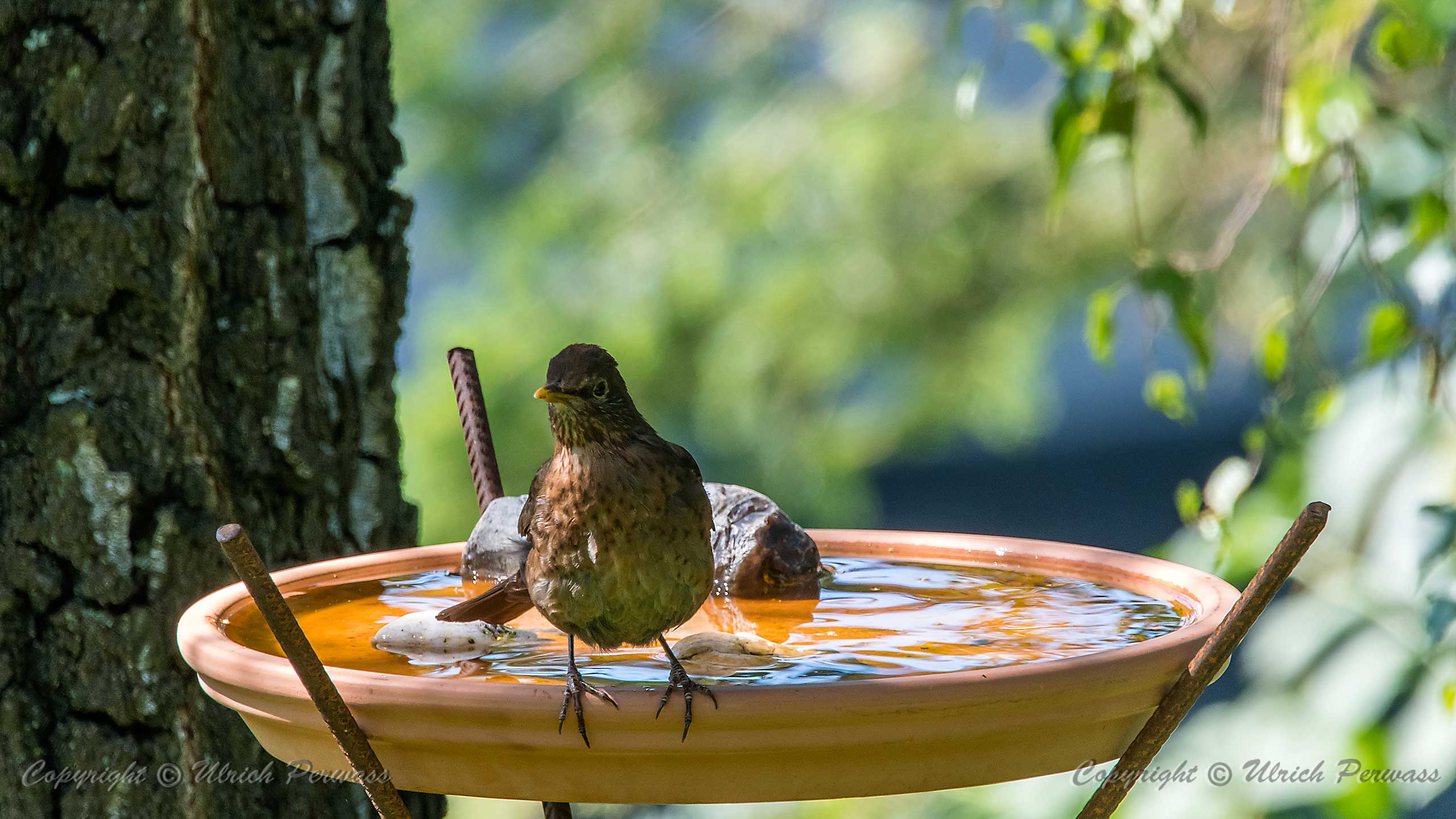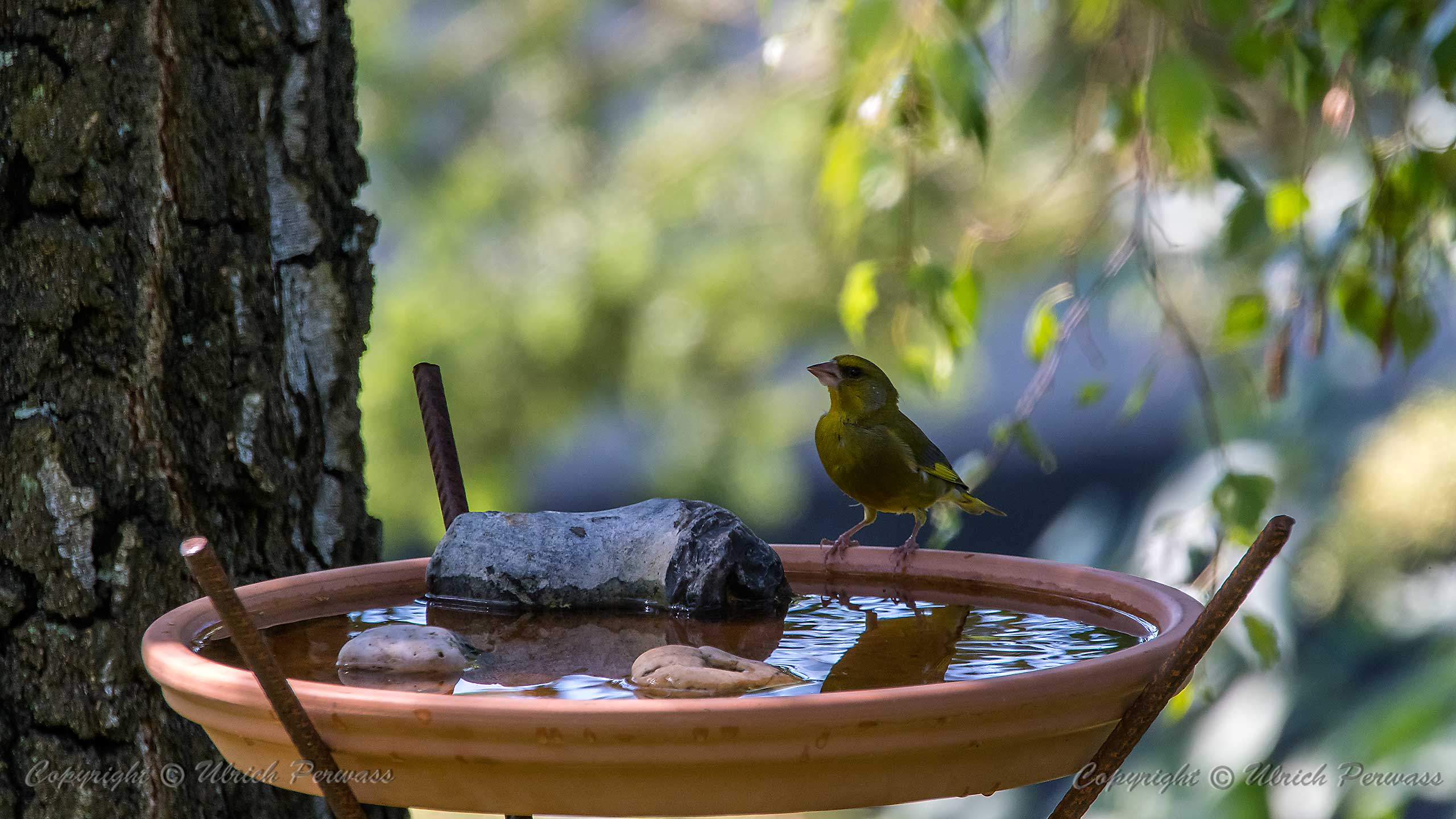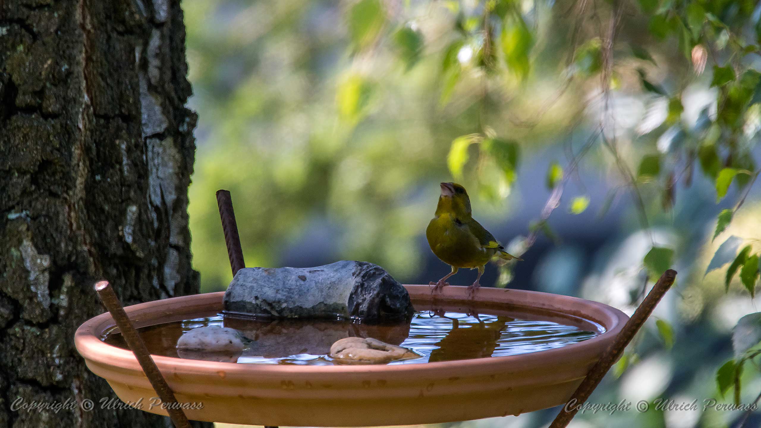 Vogeltränke Die alte Vogeltränke in unserem Garten ist inzwischen zugewachsen, so dass eine neue unumgänglich war. Diese musste aber gut einsehbar sein, um auch meiner Fotoleidenschaft zu entsprechen. Hier nun meine ersten Bilder aus etwa 20 Meter Entfernung mit dem SIGMA 150-600mm plus SIGMA Teleconverter 2x. |