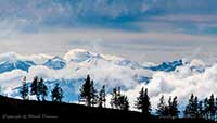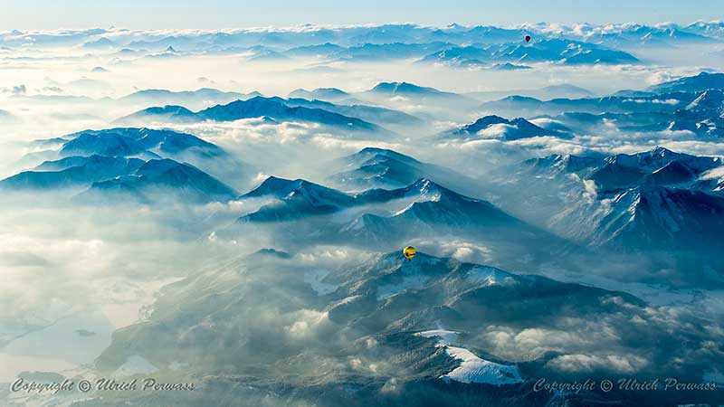 Alpenquerung mit dem Heissluftballon am 23.02.2011 Links unten der Schliersee, darüber etwa in Bildmitte verdeckt hinter der Brecherspitz der Spitzingsee und rechts daneben Stümpfling und der Rosskopf, mein letzter Alpengipfel! Gesehen aus 4335 Meter Höhe über NN bei -35°C ! |