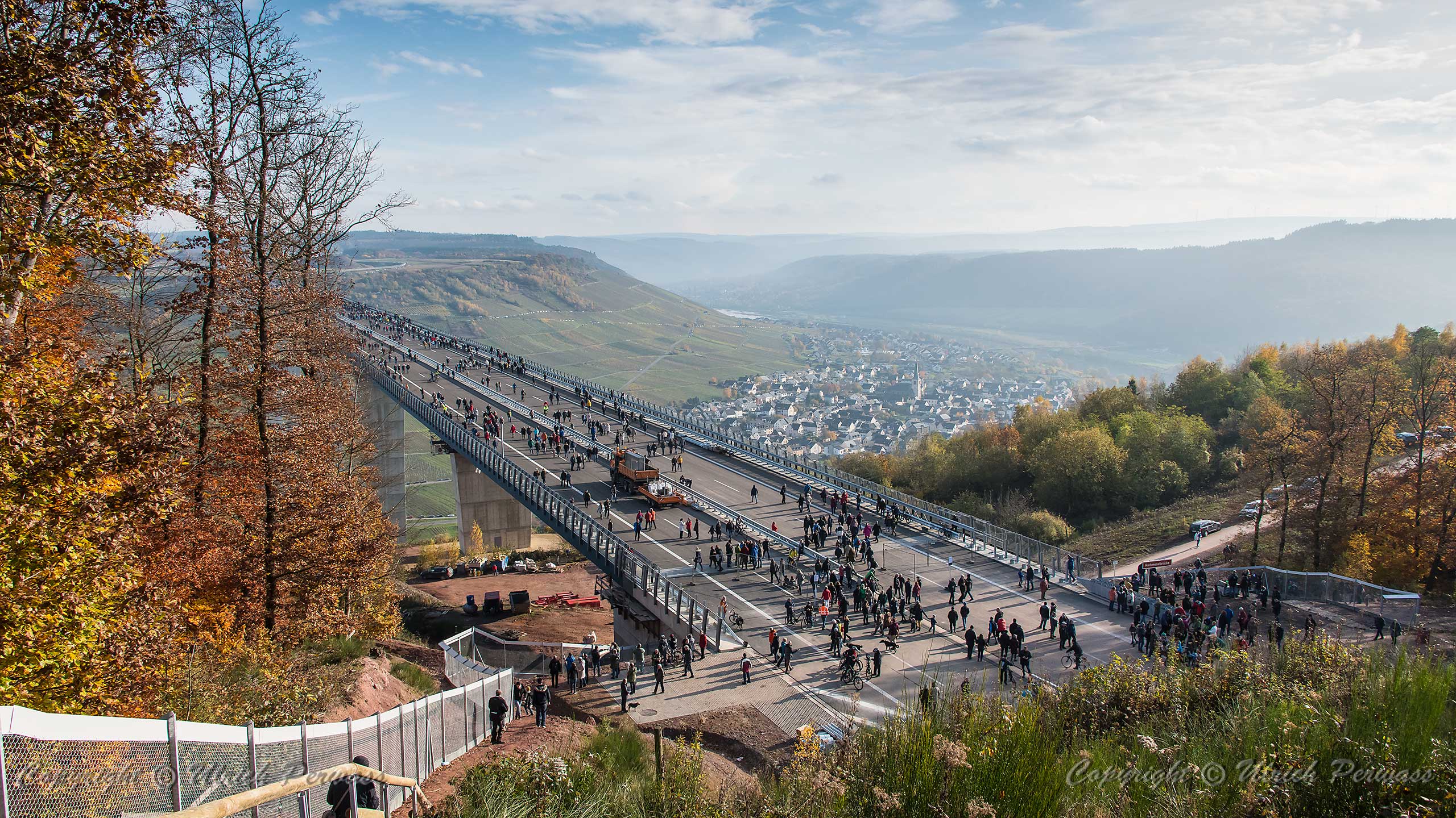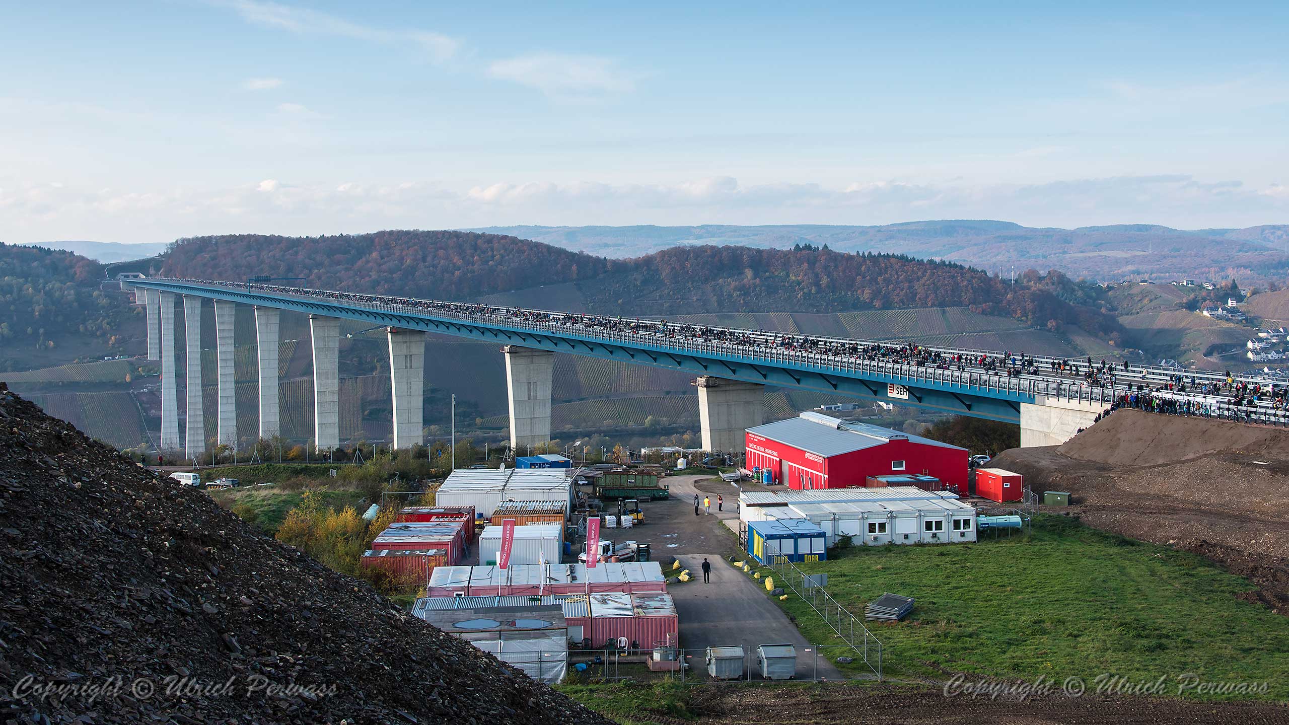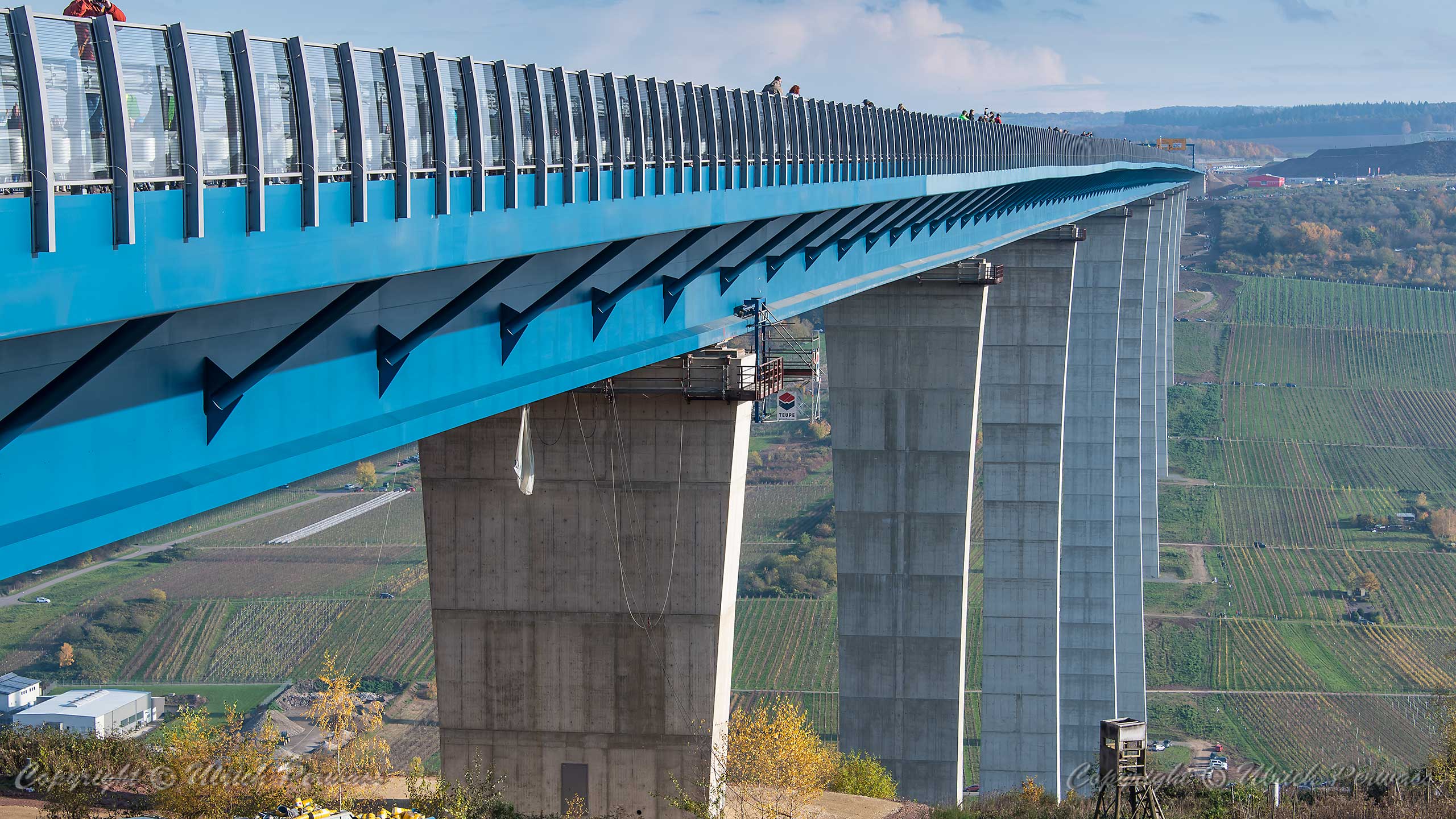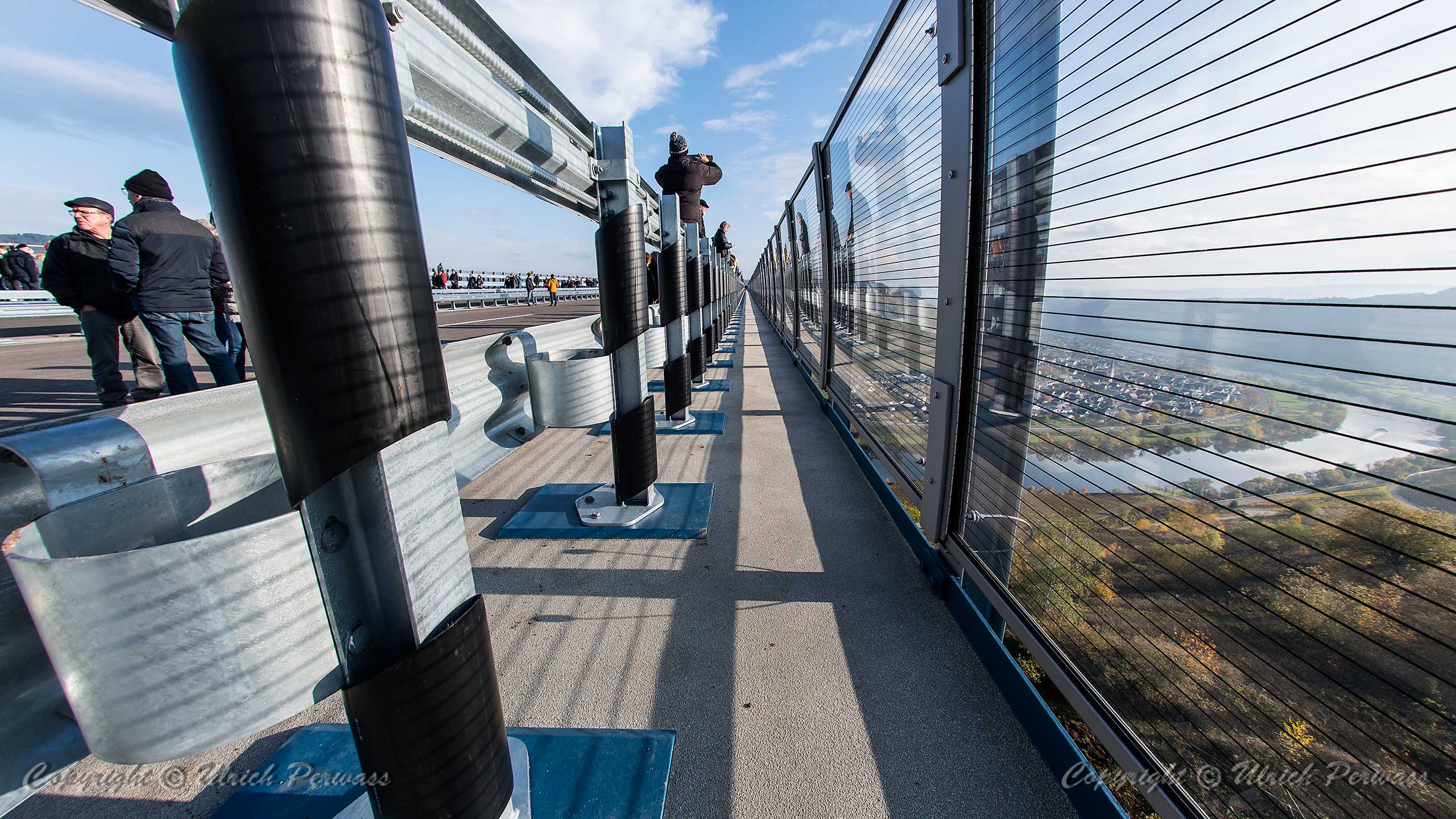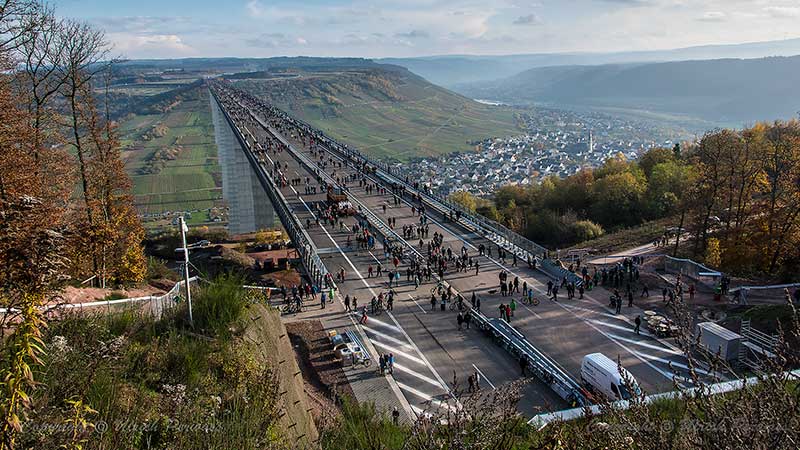 Seit dem 22. August 2015 (Galerie 1611a) begleite ich aus der Ferne den Bau dieser technisch sehr anpruchsvollen Stahlkonstruktion mit ihren tonnenschweren Bauteilen. So ist es kein Wunder, dass ich das Bürgerfest als Abschluss meiner vielfältigen Moselreisen miterleben wollte, als einer von mehr als 30.000 Besuchern, wie ich im Nachhinein erfahren habe! Viele tapfere Besucher mussten wie ich den steilen Weinberghang am Fuße der Pfeiler 4 bis 10 schnaufend erklimmen, da alle Parkplätze auf der Zufahrtsstrasse zur Brücke bereits um 10 Uhr belegt waren! Das war ein Gipfelsturm der besonderen Art!