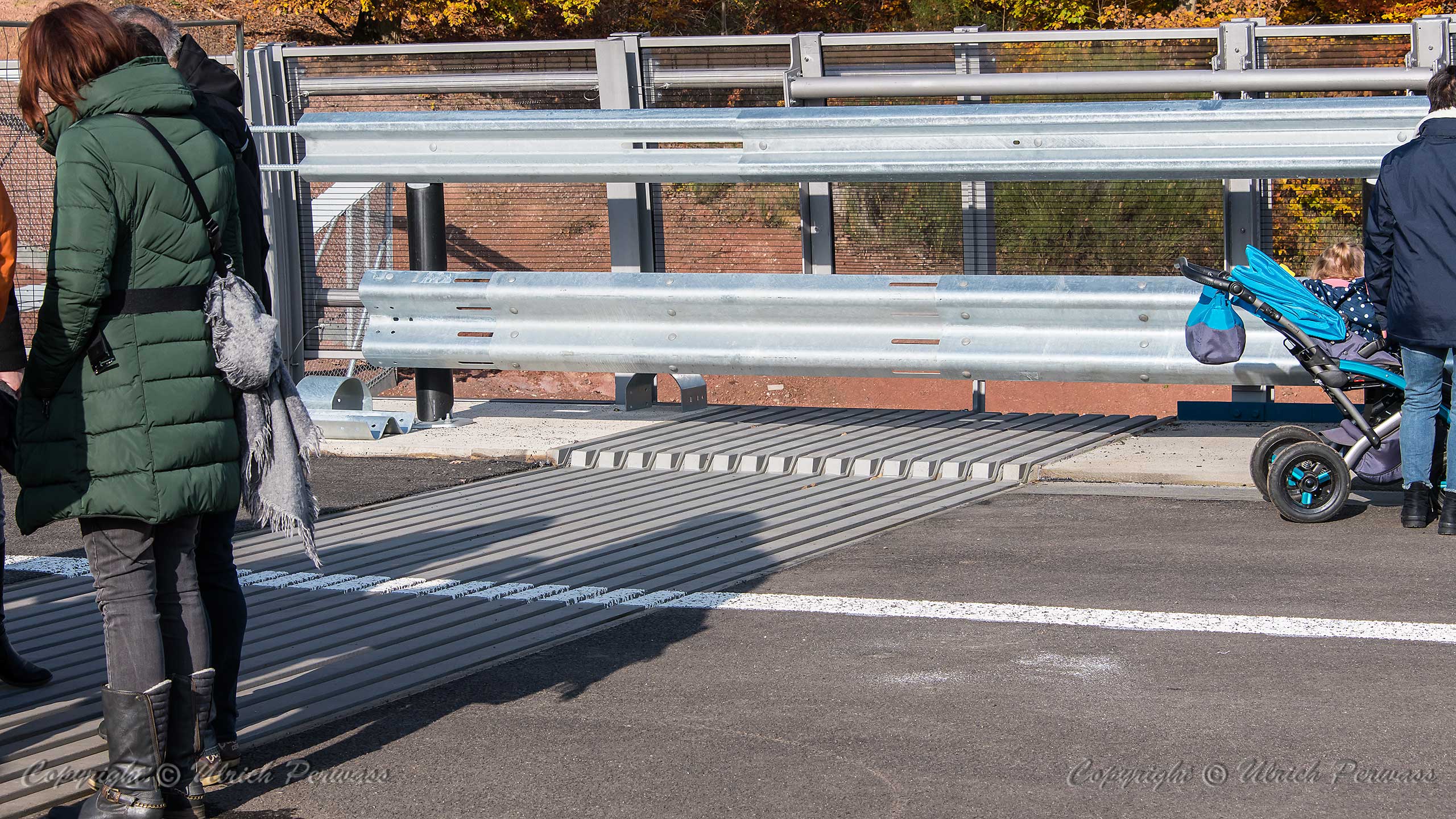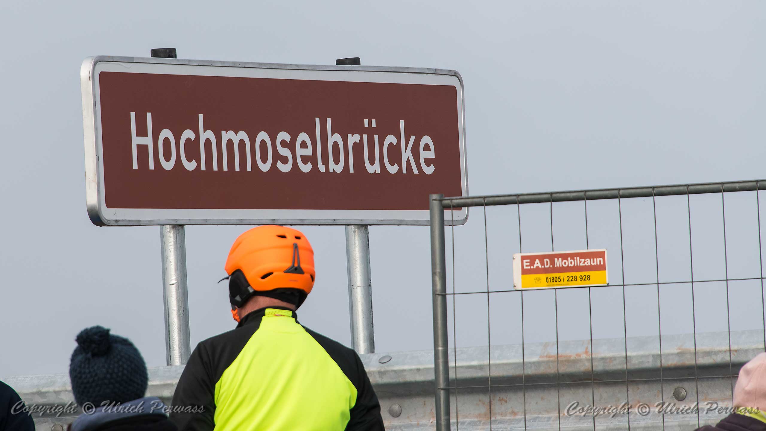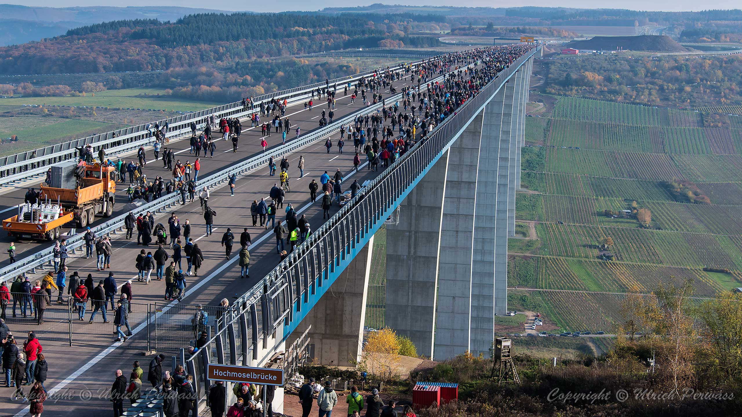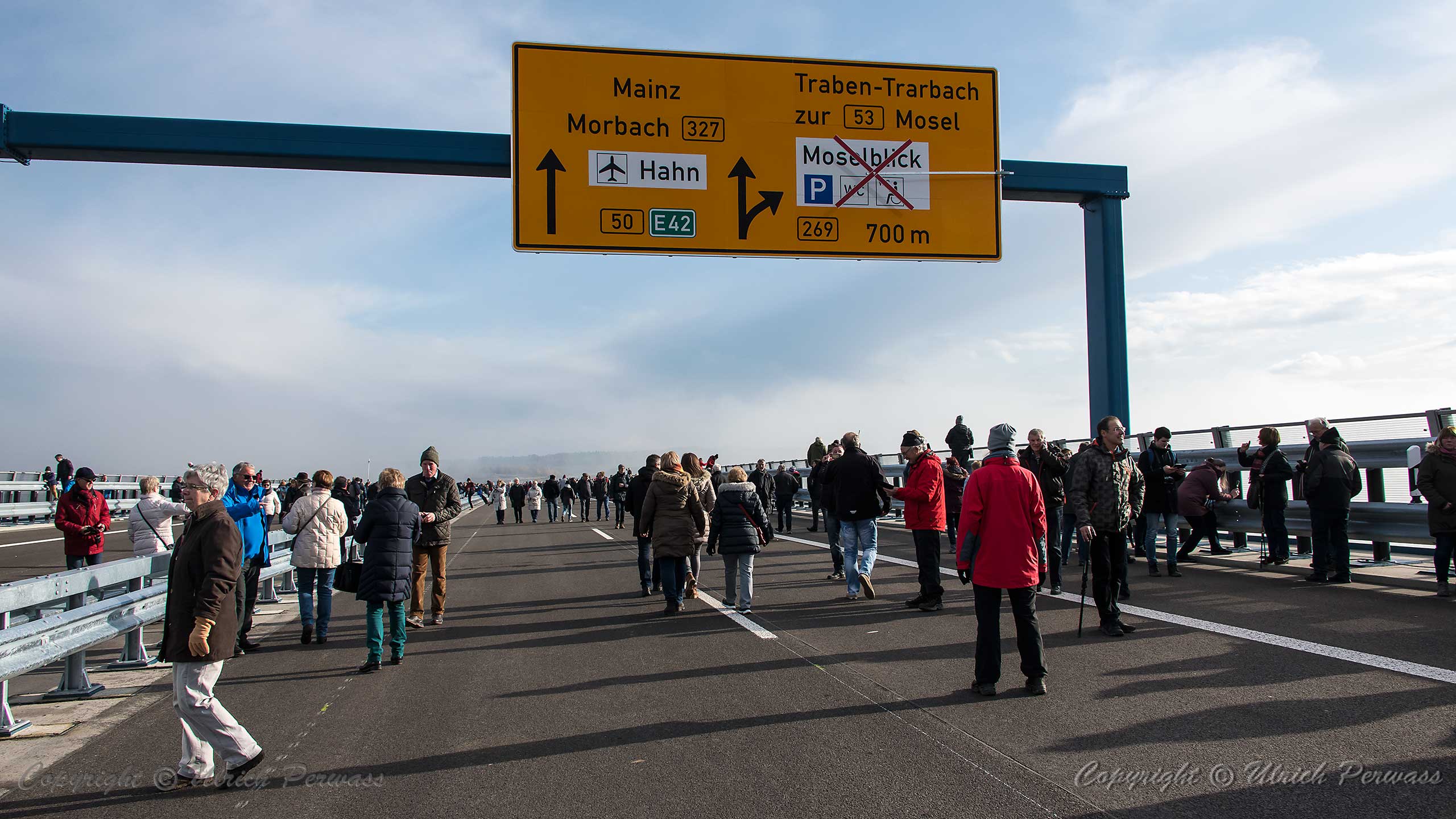 Seit dem 22. August 2015 (Galerie 1611a) begleite ich aus der Ferne den Bau dieser technisch sehr anpruchsvollen Stahlkonstruktion mit ihren tonnenschweren Bauteilen. So ist es kein Wunder, dass ich das Bürgerfest als Abschluss meiner vielfältigen Moselreisen miterleben wollte, als einer von mehr als 30.000 Besuchern, wie ich im Nachhinein erfahren habe! Viele tapfere Besucher mussten wie ich den steilen Weinberghang am Fuße der Pfeiler 4 bis 10 schnaufend erklimmen, da alle Parkplätze auf der Zufahrtsstrasse zur Brücke bereits um 10 Uhr belegt waren! Das war ein Gipfelsturm der besonderen Art!