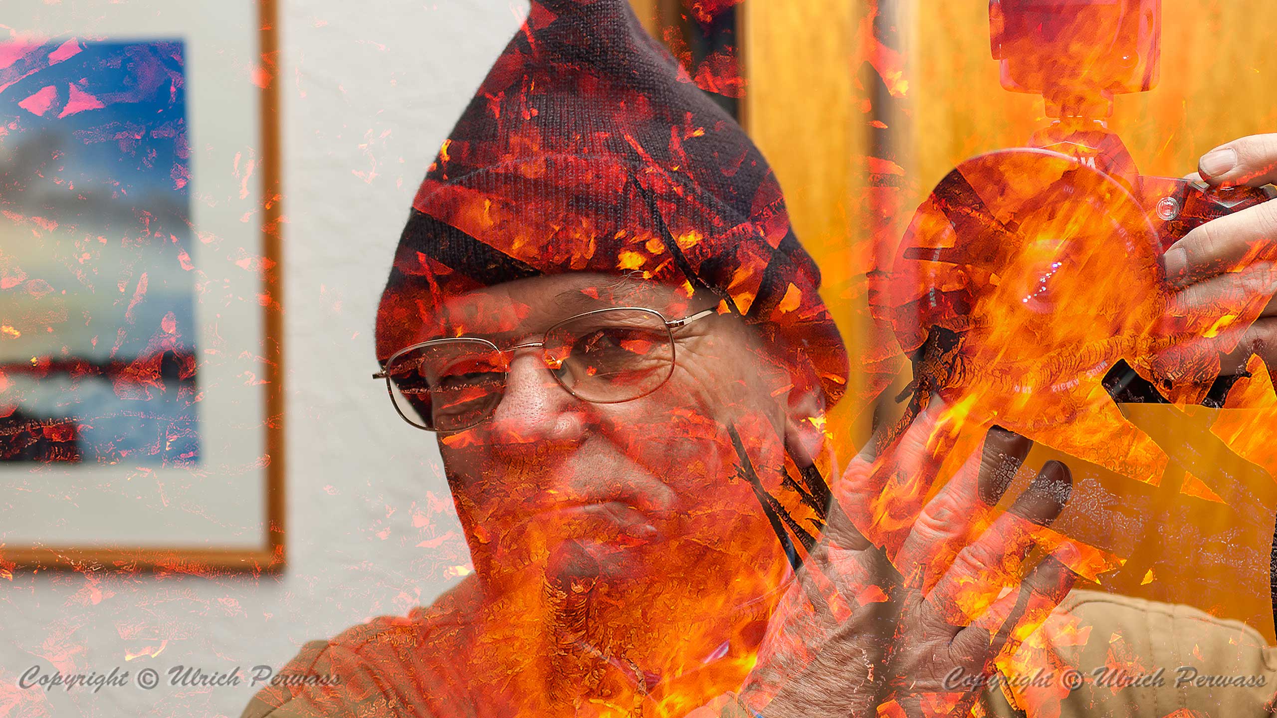 Selbstbildnis in Frerks Buernhus auf der Lorenzwarft nach dem Biikebrennen. |