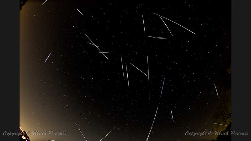 Lyriden Sie sind ein Meteorstrom, der schon seit Jahrhunderten (seit 687 v. Chr.) im Frühling zu beobachten ist. Der Name Lyride leitet sich vom antiken Zupfinstrument Lyra ab, da der Meteorstrom aus dem Sternbild der Leier (lyra) zu entströmen scheint. Die Zahl der Meteore pro Stunde soll bei etwa 18 liegen. Das Maximum sollte laut Zeitung am 22. April zu beobachten sein, was mich bewegte, meine NIKON D850 auf meinem Schornstein zu platzieren. Leider war die Ausbeute nach 4 1/2 Stunden äußerst gering, da auch das Licht vom Flughafen Köln-Bonn sich sehr störend bemerkbar machte. Die Perseiden sind Mitte August besser zu beobachten:
