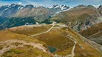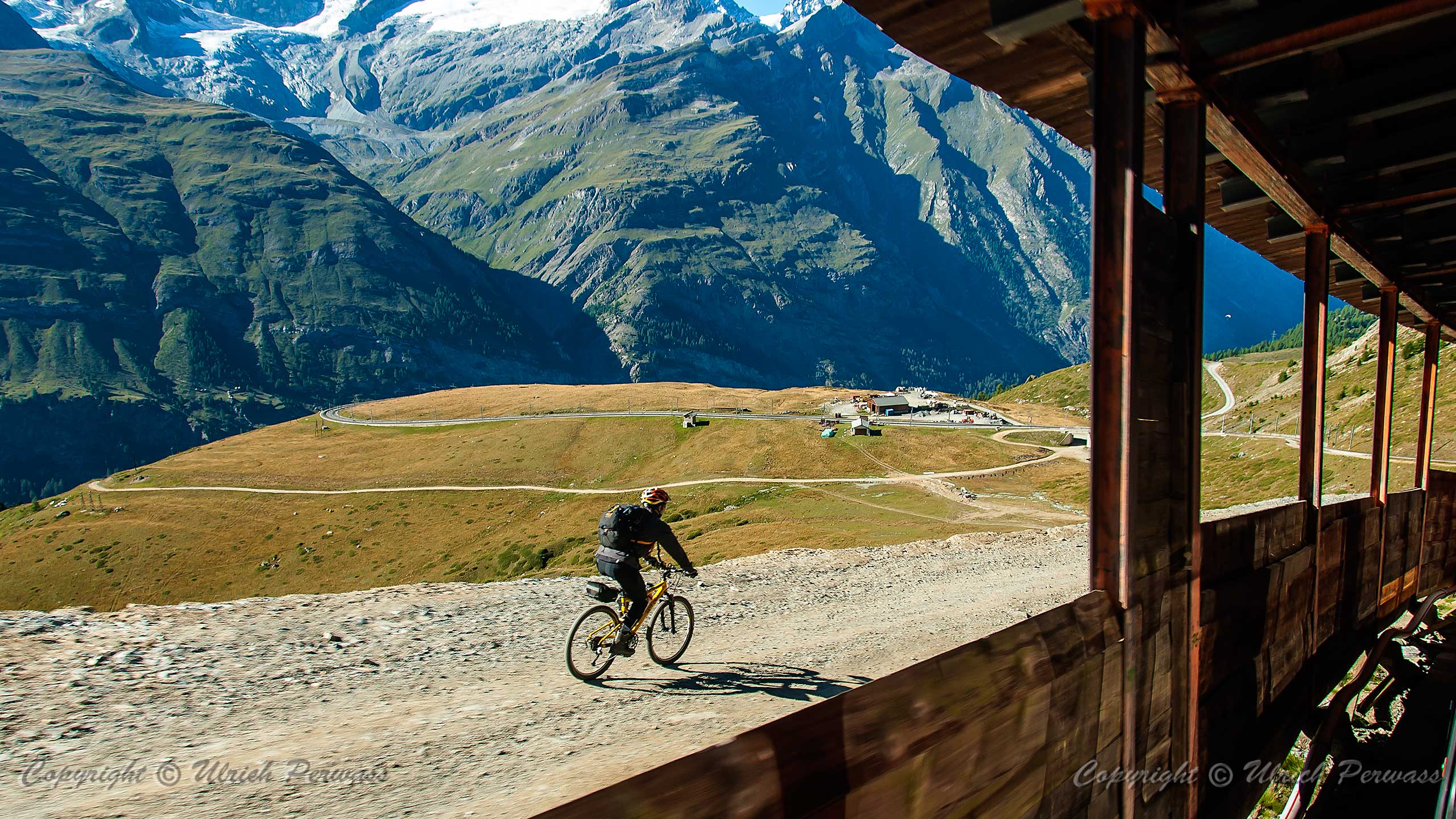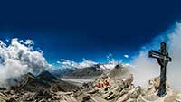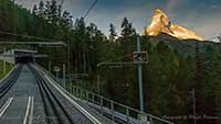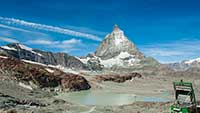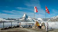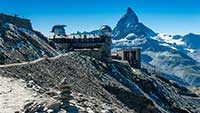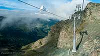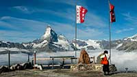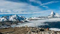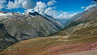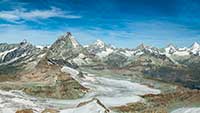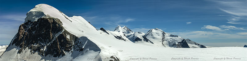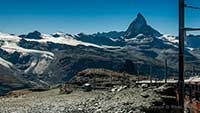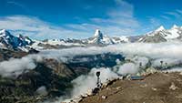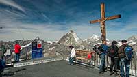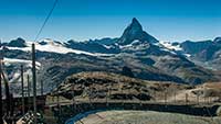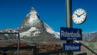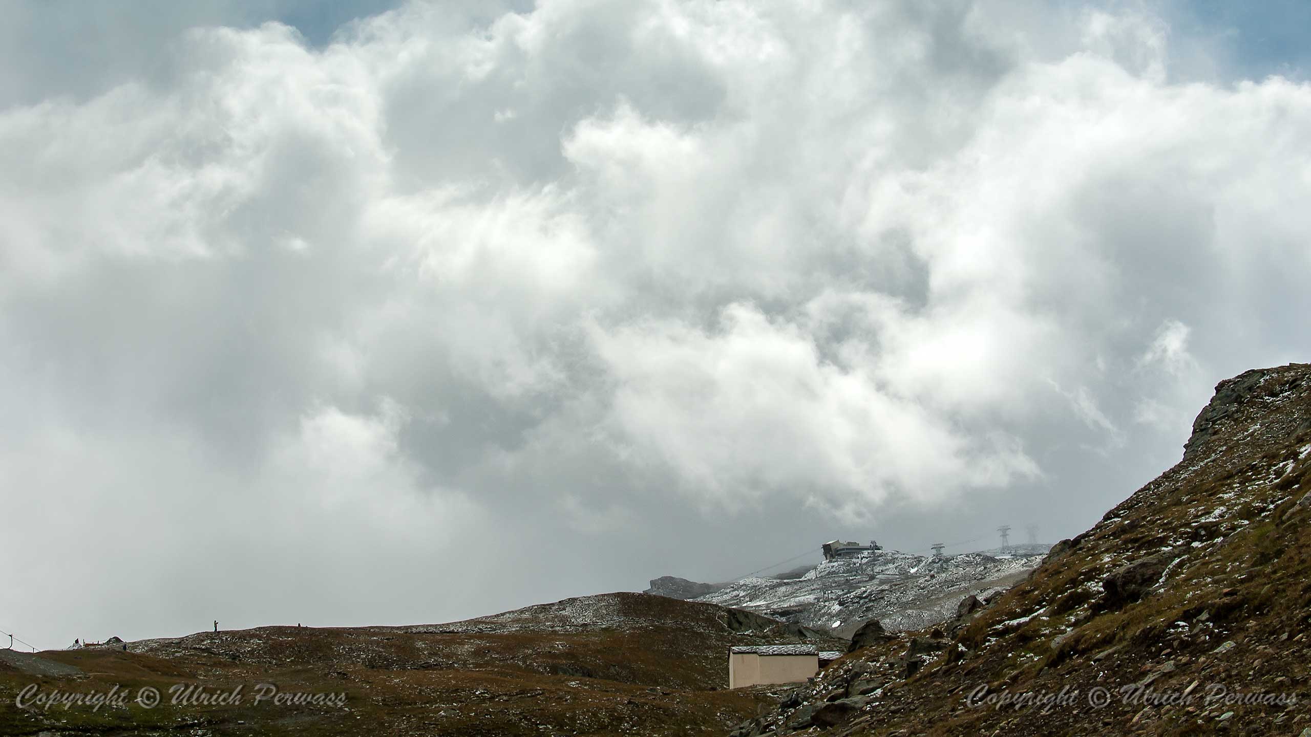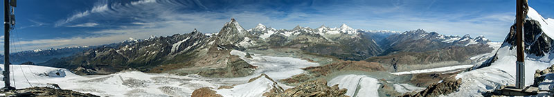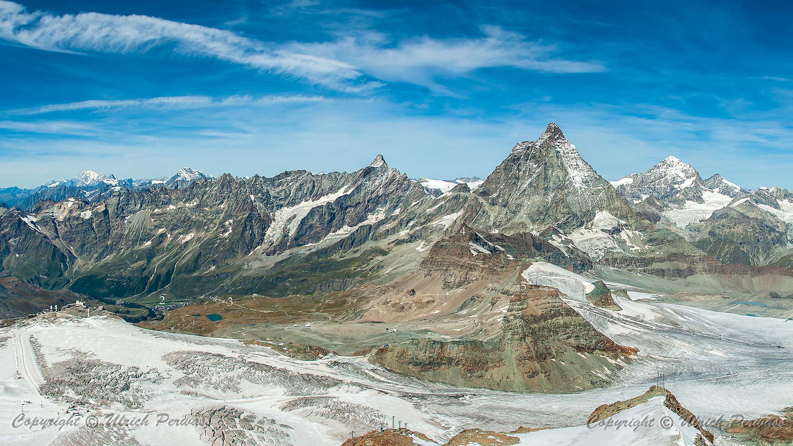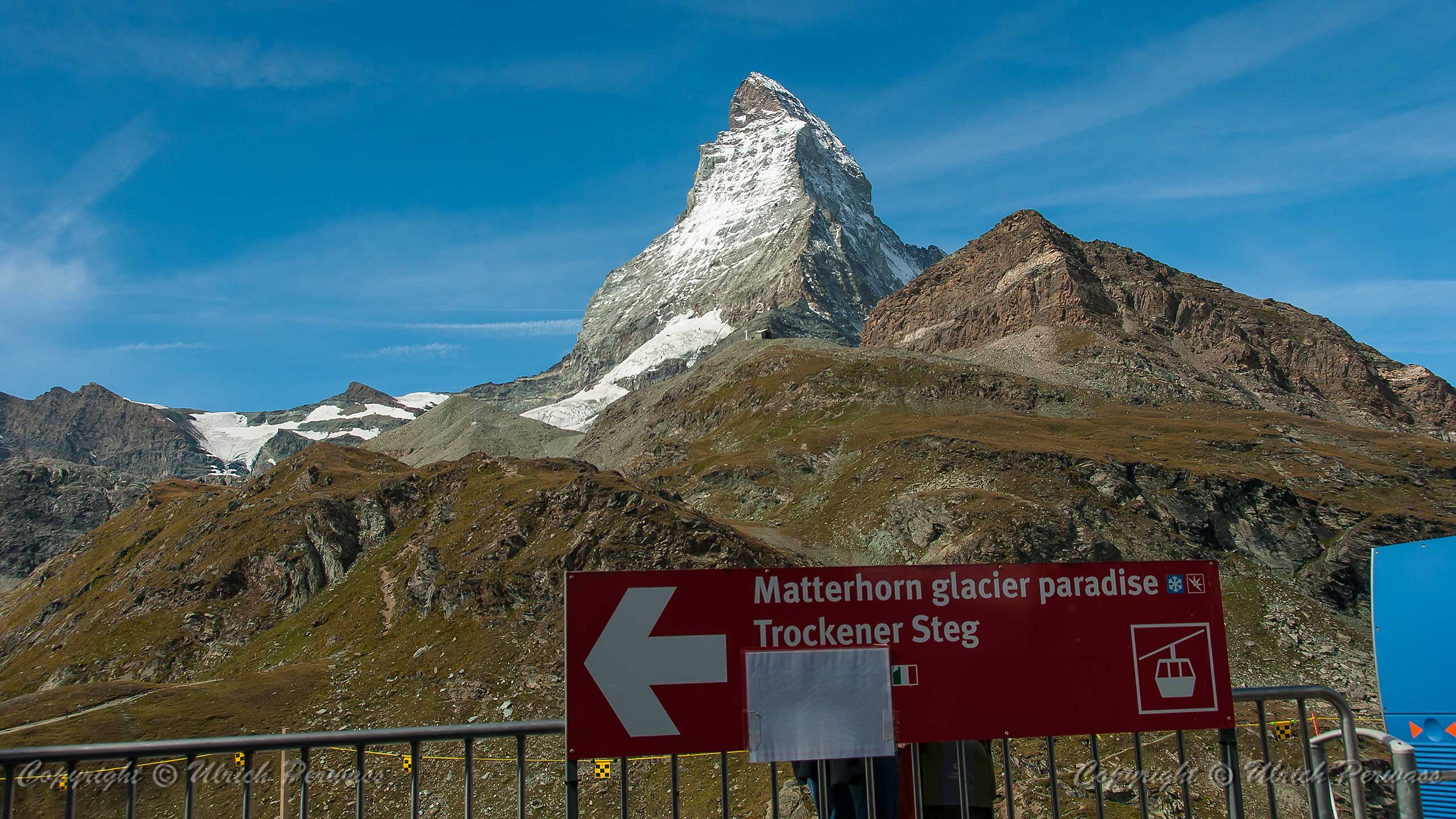 Tag 7 Tag 1, Tag 2, Tag 3, Tag 4, Tag 5, Tag 6, Tag 7, Tag 8, Tag 9 Morgens um 6:51 Uhr reizte mich die Sonne am Matterhorn noch vor dem eigentlich vorgesehenen langen Trockner-Steg-Trail die nächsten Panoramaaufnahmen vom Bahnhof Rotenboden der Gornergratbahn zu machen. Erst um 11 Uhr ging es dann von Zermatt ab zum Schwarzsee und von dort zum Klein Matterhorn. Dort bot sich mir ein überwältigendes Panorama bis weit nach Italien hinein. Breithorn, Dufourspitze und weitere 4-Tausender waren das Ziel meiner NIKON D200. Nach der Besichtigung des Eispalastes am Klein Matterhorn ging es dann endlich ab zur Liftstation Trockner Steg. Um 14:13 Uhr startete ich dort zum Schwarzsee, wo ich nach anstrengender Wanderung um 16:51 Uhr an der Liftstation Schwarzsee ankam. Zunächst Panoramen vom Klein Matterhorn: |