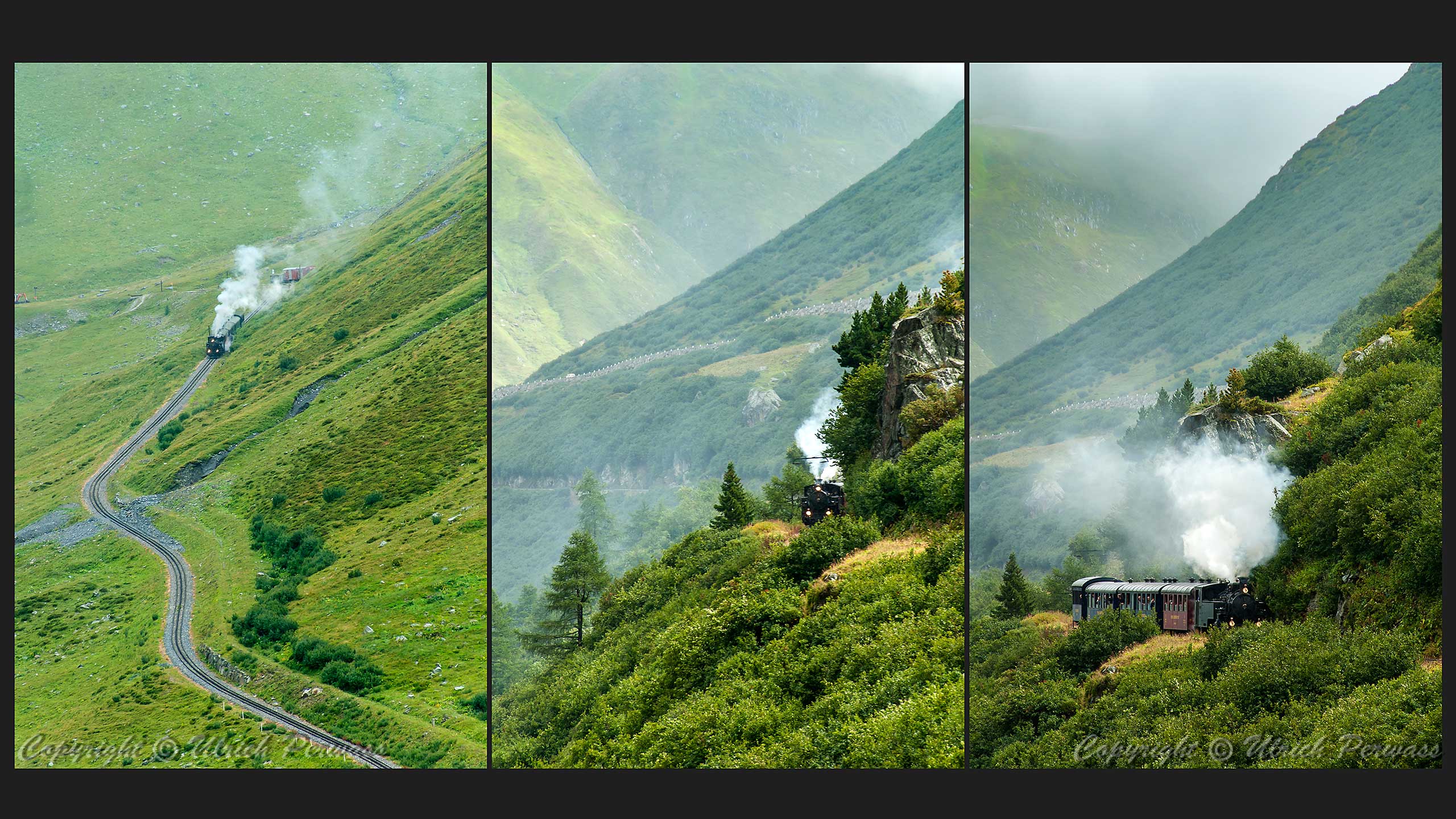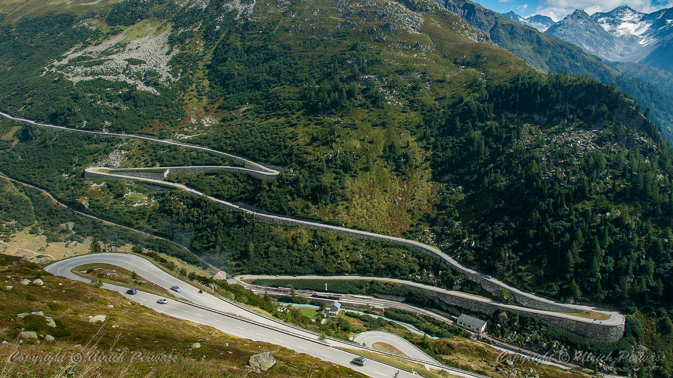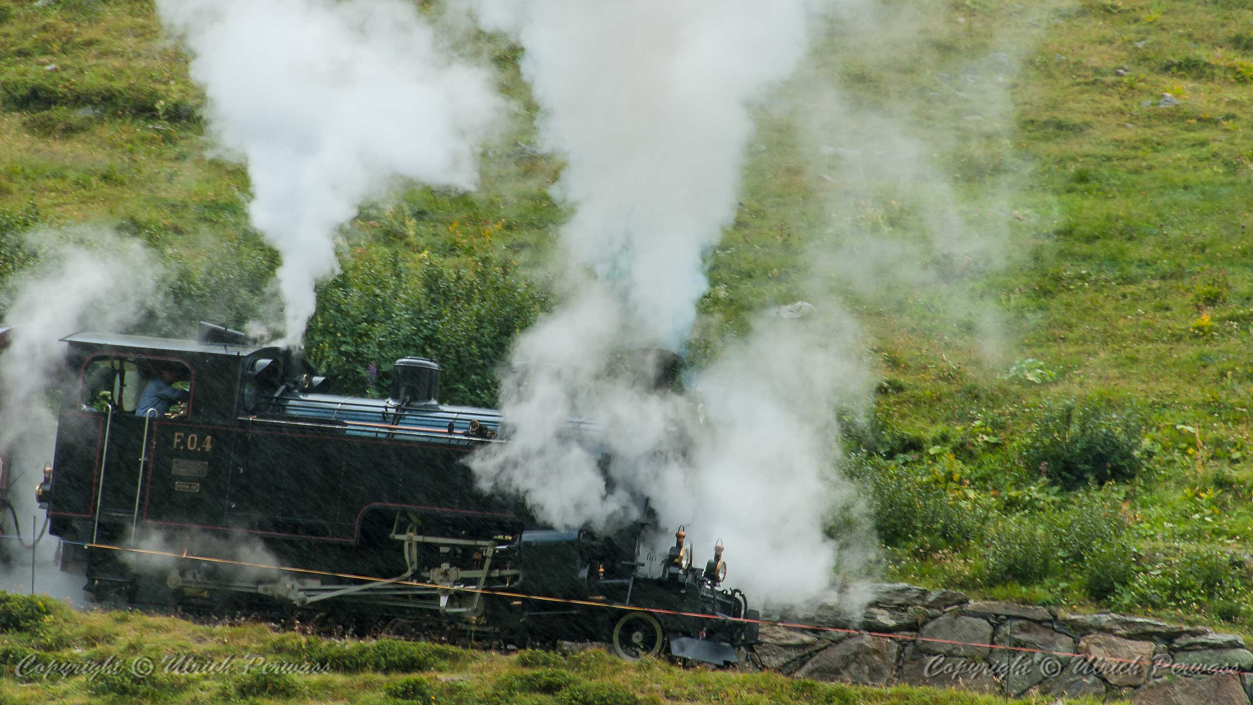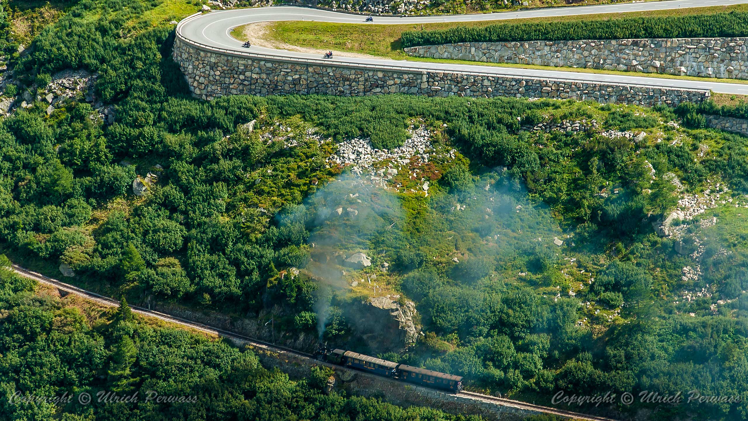 Das nächste Ziel war Gletsch im Rhonetal an der Furkabergstrecke der Zahnradbahn. Dort fädelte ich mich in die Serpentinen des Grimselpasses ein, die ich schon bei der Anreise vom Furkapass aus sehr bestaunt und fotografiert hatte. Nach wiederholtem Halt für Fotozwecke erreichte ich die Talsperre Grimselsee hoch oben am Grimselpass. Nach kurzer Ruhepause ging es dann weiter über Luzern, Basel und Frankfurt 670 km nach Hause bei Köln. Eine wunderschöne Fotosafari war vorbei, die mich bis heute fasziniert!