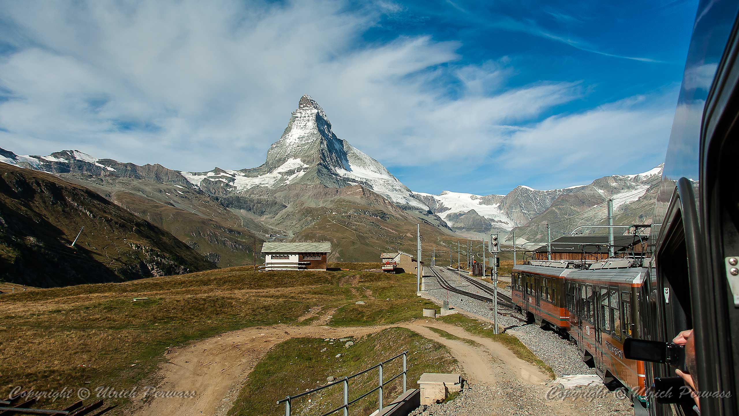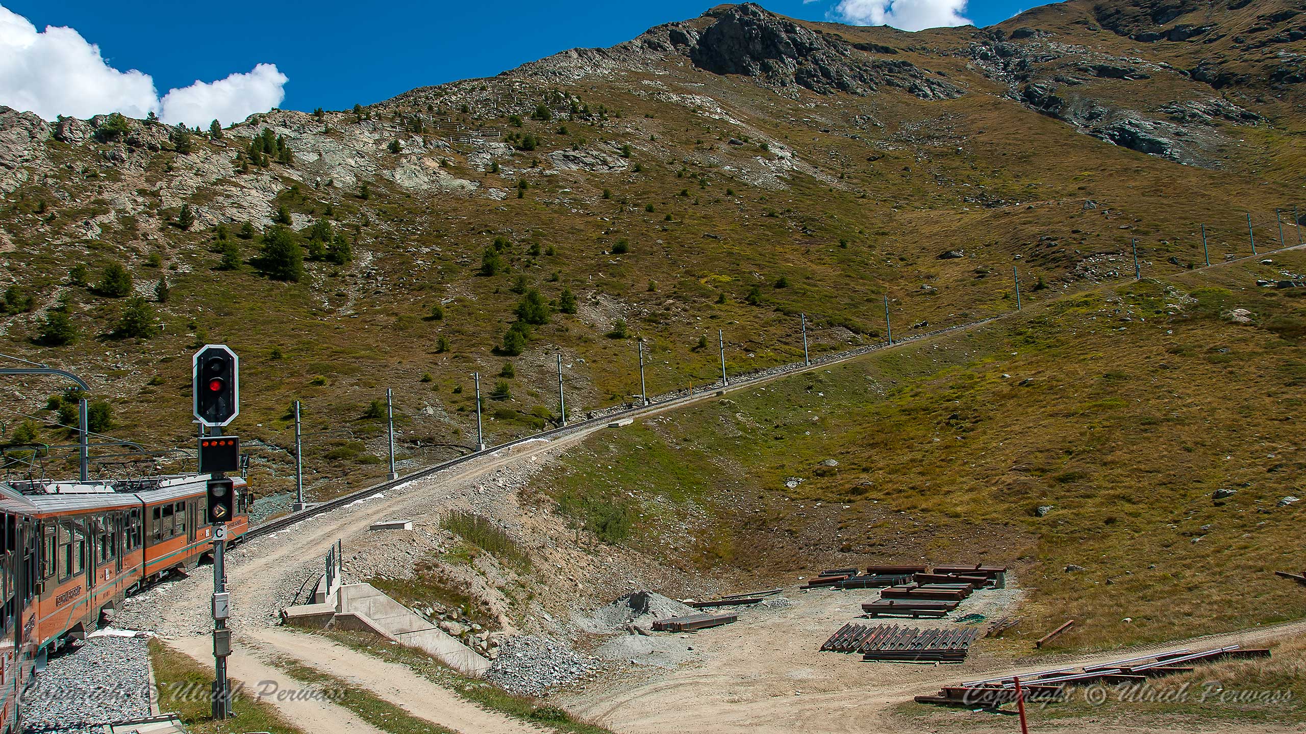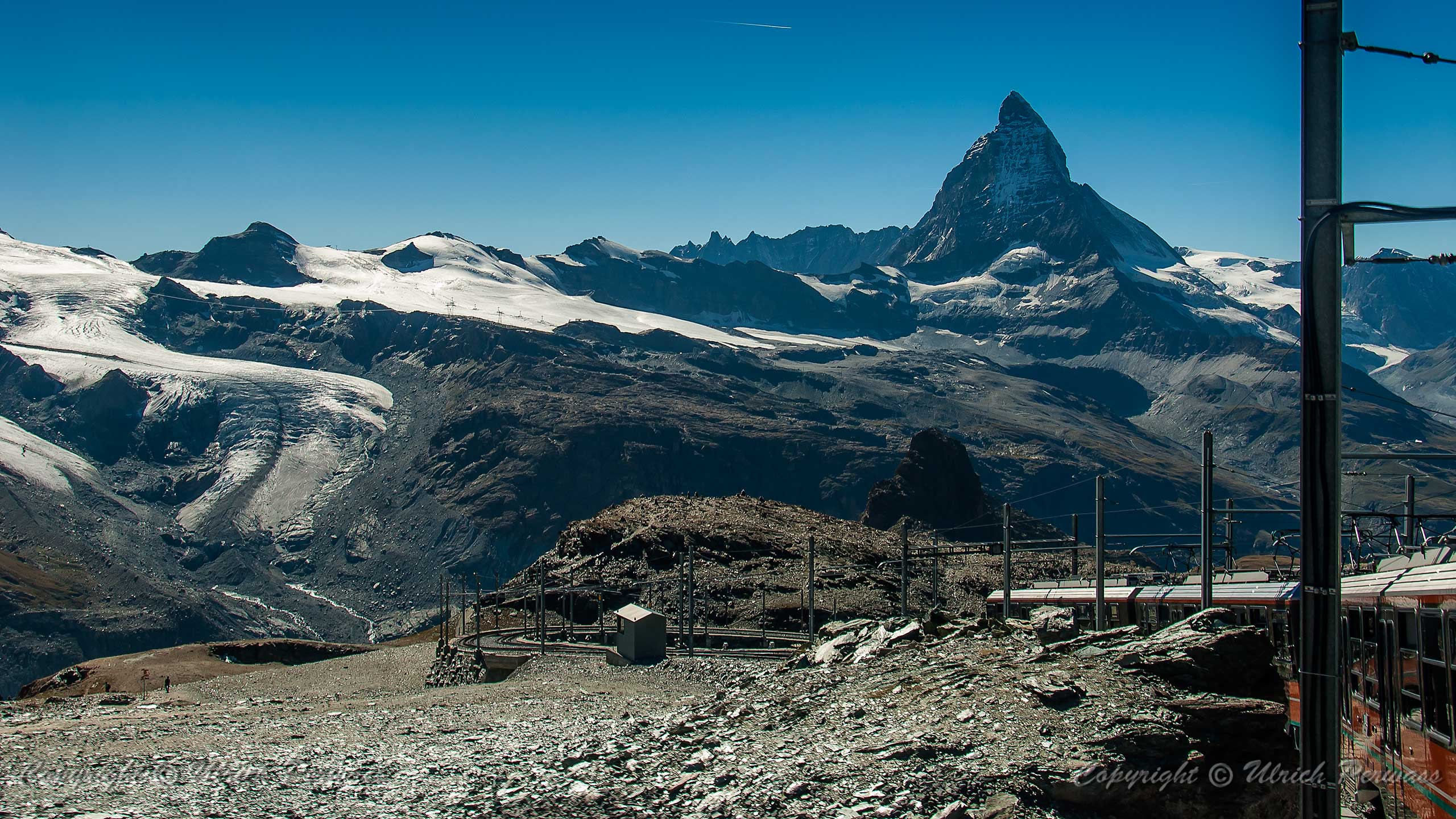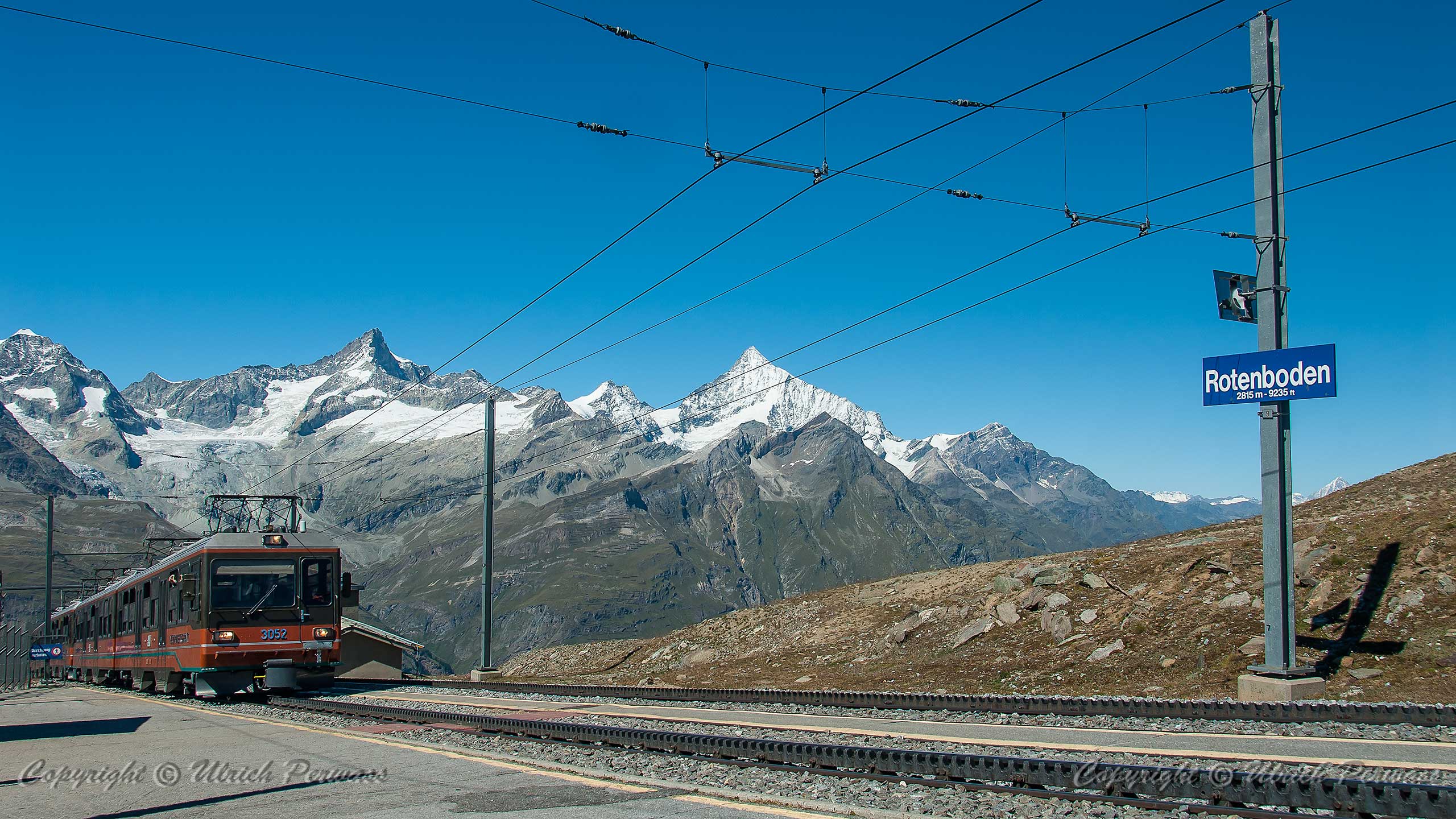 Tag 6 Die Matterhornspiegelung war auch am sechsten Tag angesagt. Dazu fuhr ich erstmals mit der Gornergratbahn 9,34 Kilometer mit maximal 20% Steigung von 1.604 Meter in Zermatt bis auf 3.089 Meter auf dem Gornergrat bergan. Das sind 1.485 Meter Höhenunterschied mit durchschnittlich 15,9% Steigung! Diese Zahnradbahn fährt mit dreiphasigem Drehstromantrieb 750V/50Hz, wobei zwei Phasen über zwei Oberleitungen und die dritte Phase über das Gleis zugeführt werden. Am Bahnhof Rotenbogen (2.918 m) machte ich eine längere Zwischenstation für die beiden Riffelseen mit ihren herrlichen Matterhornspiegelungen und für einen ersten Blick auf den Gornergratgletscher von der Flanke des Riffelhorns aus. Danach ging es dann weiter bis zum Endbahnhof Gornergrat, um dort gemeinsam mit Bergdohlen mein Mittagessen einzunehmen.