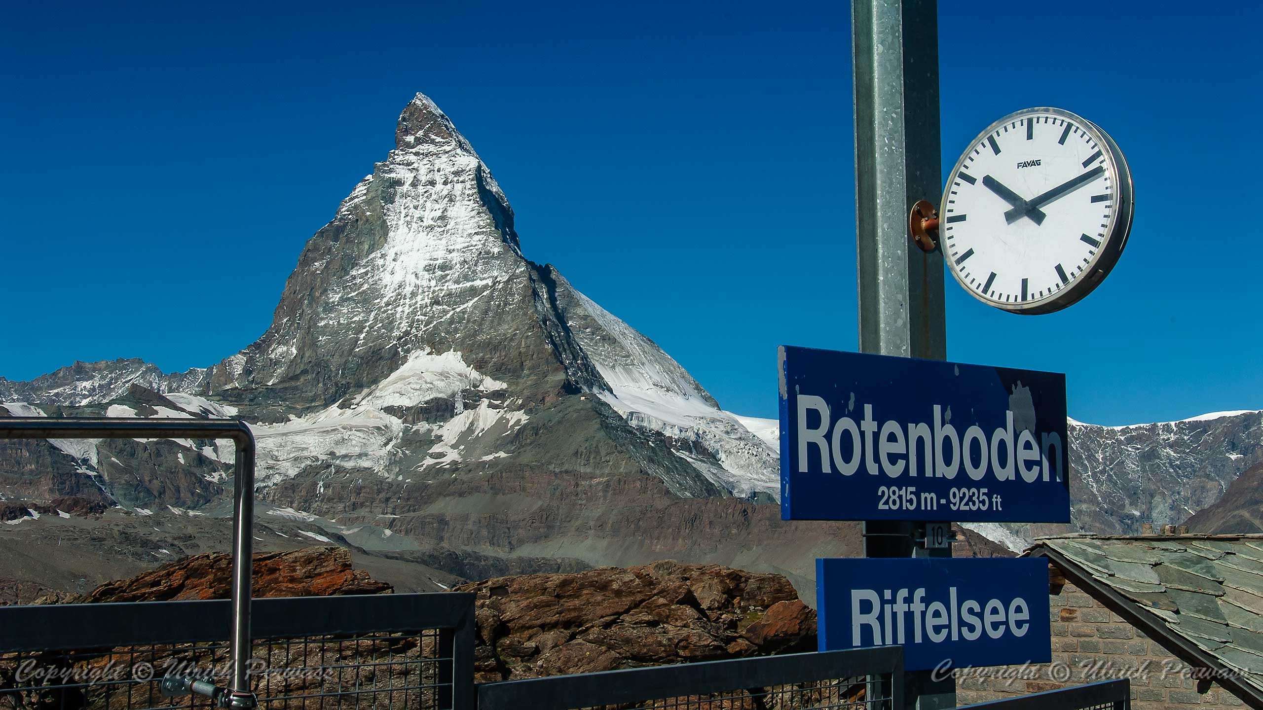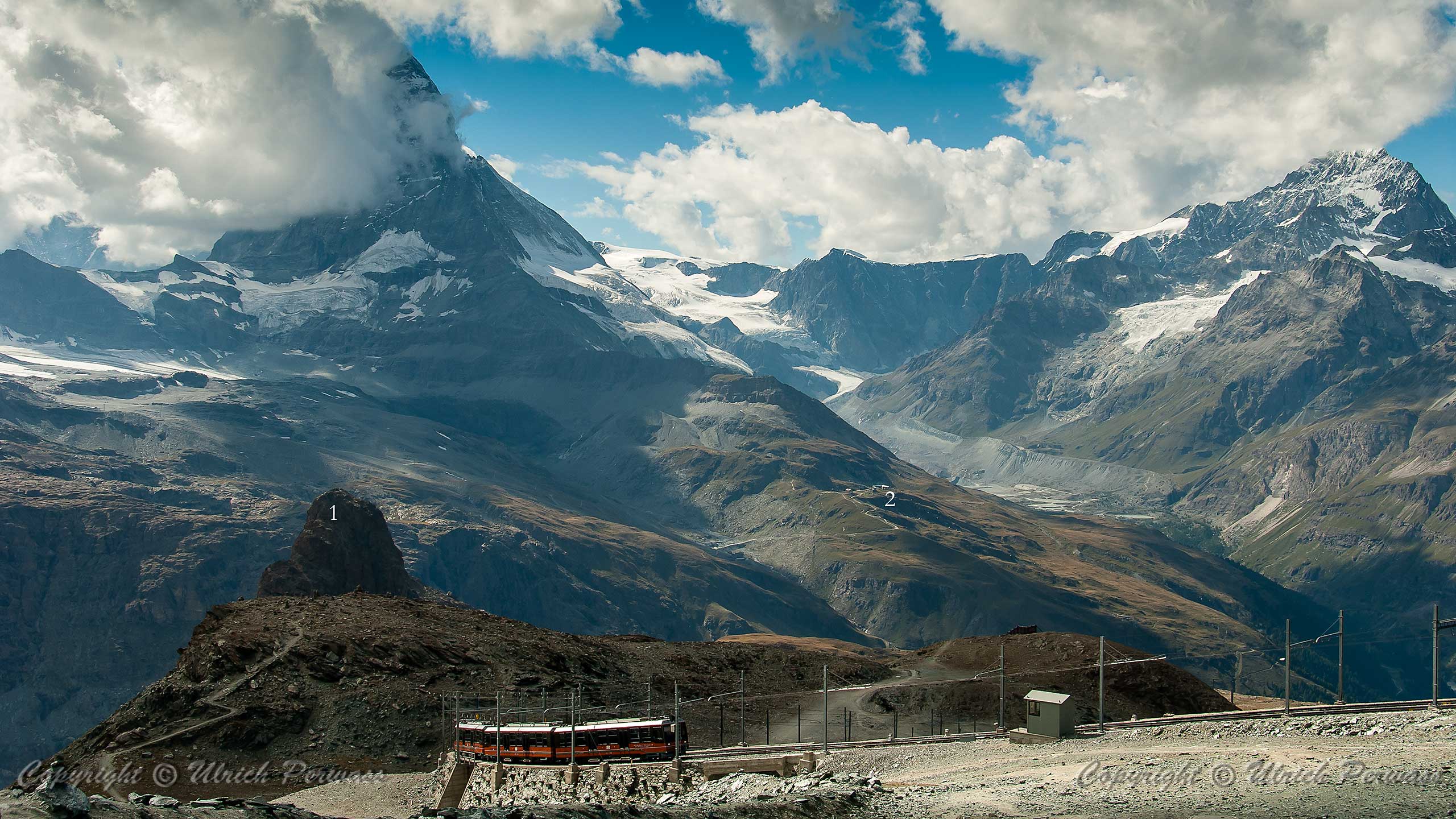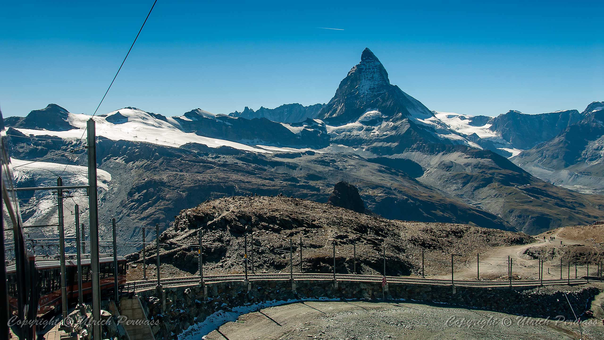 Tag 6 Die Matterhornspiegelung war auch am sechsten Tag angesagt. Dazu fuhr ich erstmals mit der Gornergratbahn 9,34 Kilometer mit maximal 20% Steigung von 1.604 Meter in Zermatt bis auf 3.089 Meter auf dem Gornergrat bergan. Das sind 1.485 Meter Höhenunterschied mit durchschnittlich 15,9% Steigung! Diese Zahnradbahn fährt mit dreiphasigem Drehstromantrieb 750V/50Hz, wobei zwei Phasen über zwei Oberleitungen und die dritte Phase über das Gleis zugeführt werden. Am Bahnhof Rotenbogen (2.918 m) machte ich eine längere Zwischenstation für die beiden Riffelseen mit ihren herrlichen Matterhornspiegelungen und für einen ersten Blick auf den Gornergratgletscher von der Flanke des Riffelhorns aus. Danach ging es dann weiter bis zum Endbahnhof Gornergrat, um dort gemeinsam mit Bergdohlen mein Mittagessen einzunehmen.