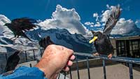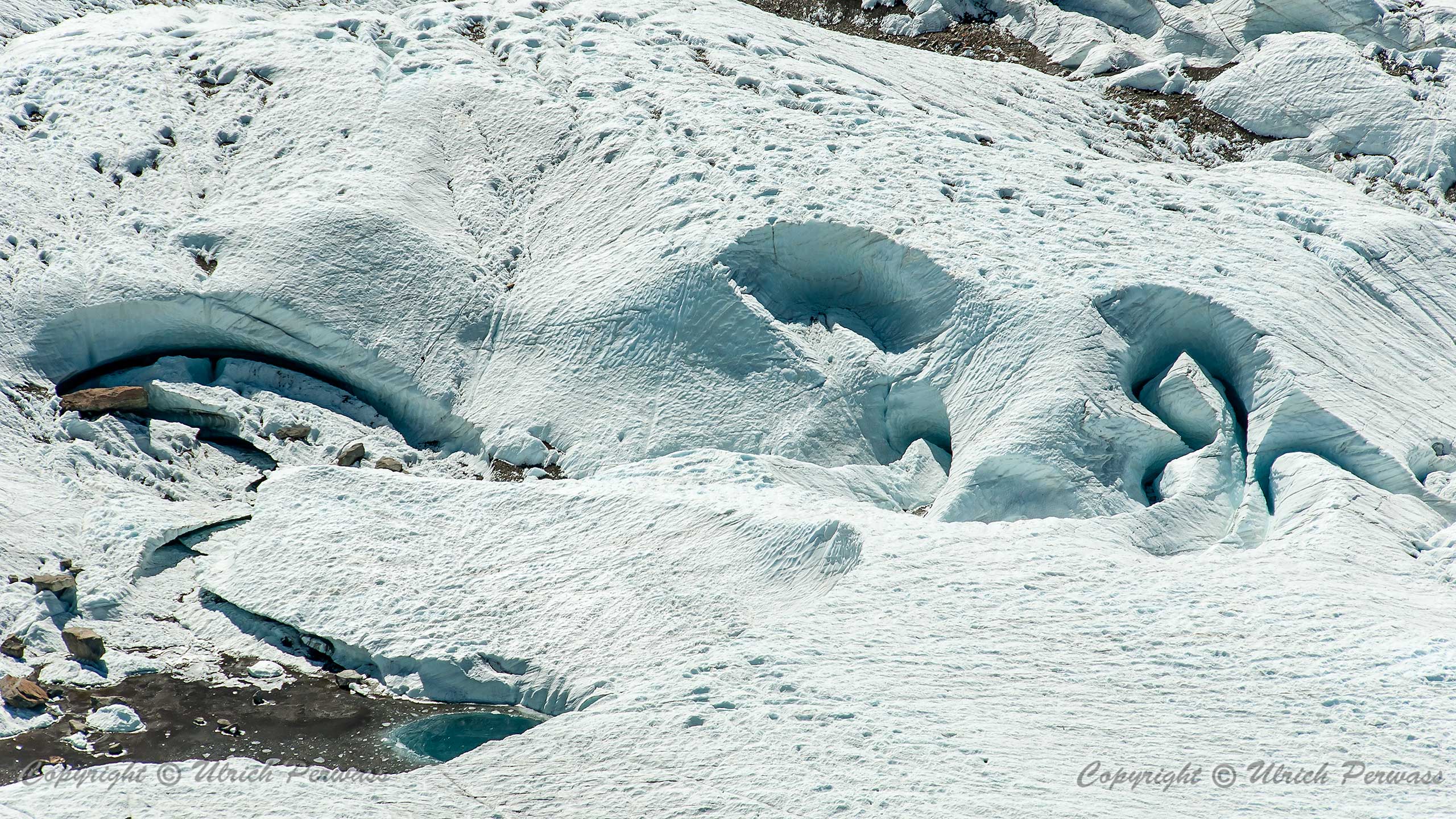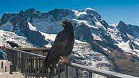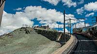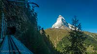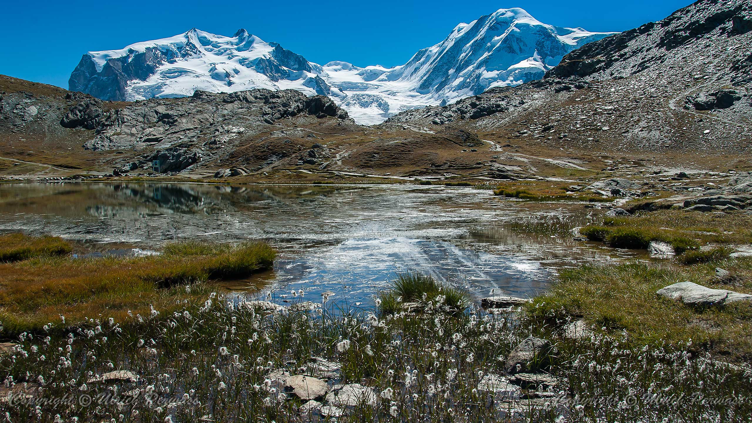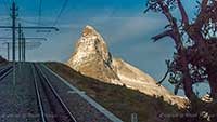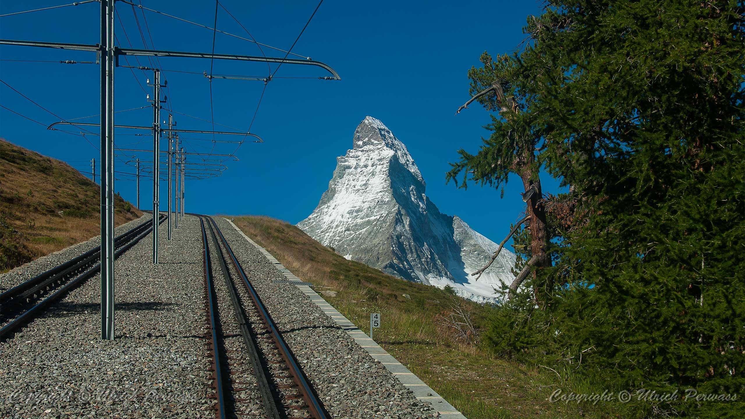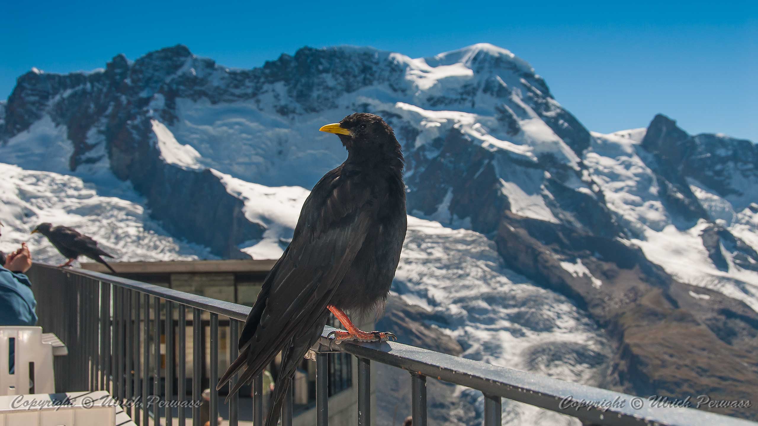 Tag 6 Die Matterhornspiegelung war auch am sechsten Tag angesagt. Dazu fuhr ich erstmals mit der Gornergratbahn 9,34 Kilometer mit maximal 20% Steigung von 1.604 Meter in Zermatt bis auf 3.089 Meter auf dem Gornergrat bergan. Das sind 1.485 Meter Höhenunterschied mit durchschnittlich 15,9% Steigung! Diese Zahnradbahn fährt mit dreiphasigem Drehstromantrieb 750V/50Hz, wobei zwei Phasen über zwei Oberleitungen und die dritte Phase über das Gleis zugeführt werden. Am Bahnhof Rotenbogen (2.918 m) machte ich eine längere Zwischenstation für die beiden Riffelseen mit ihren herrlichen Matterhornspiegelungen und für einen ersten Blick auf den Gornergratgletscher von der Flanke des Riffelhorns aus. Danach ging es dann weiter bis zum Endbahnhof Gornergrat, um dort gemeinsam mit Bergdohlen mein Mittagessen einzunehmen.