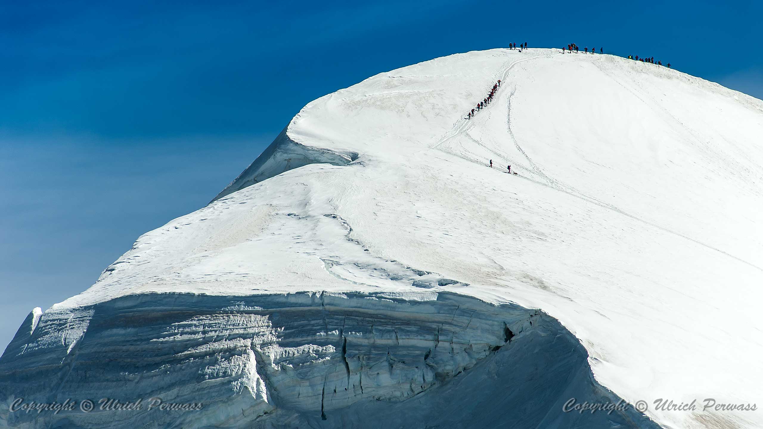 Aufstieg zum Breithorn links. In der Mitte die Dufourspitze |