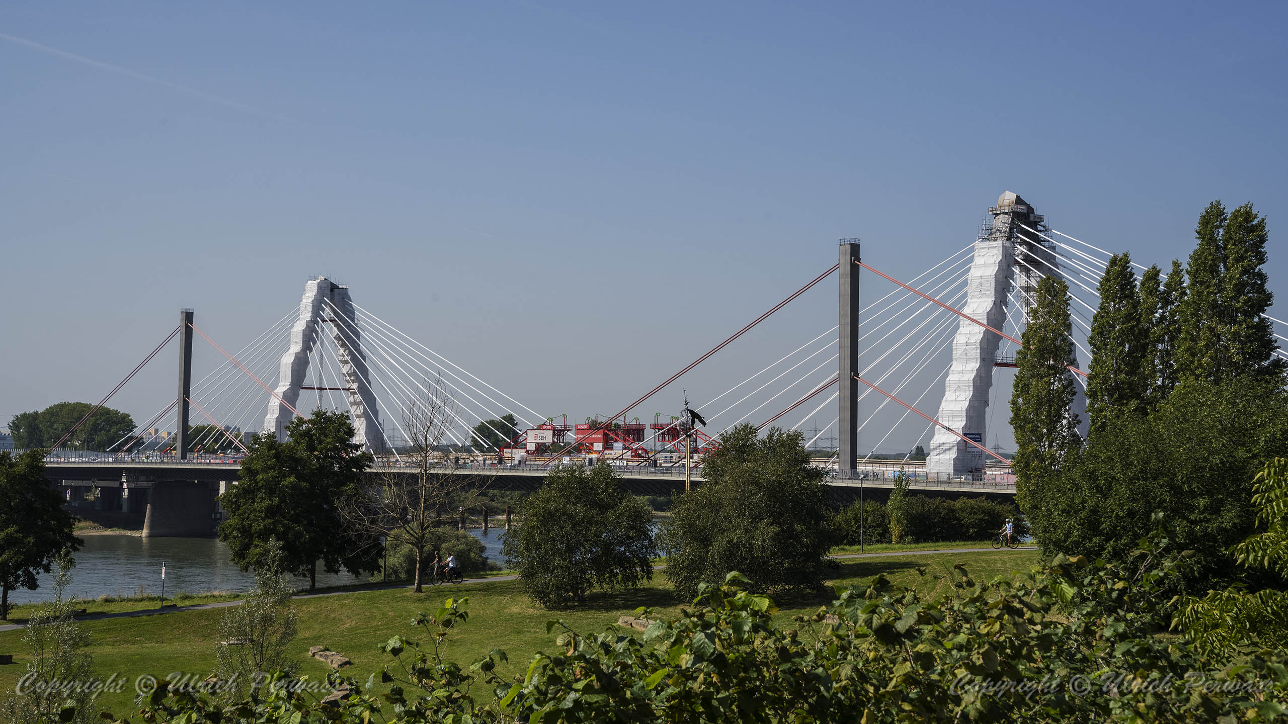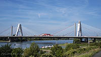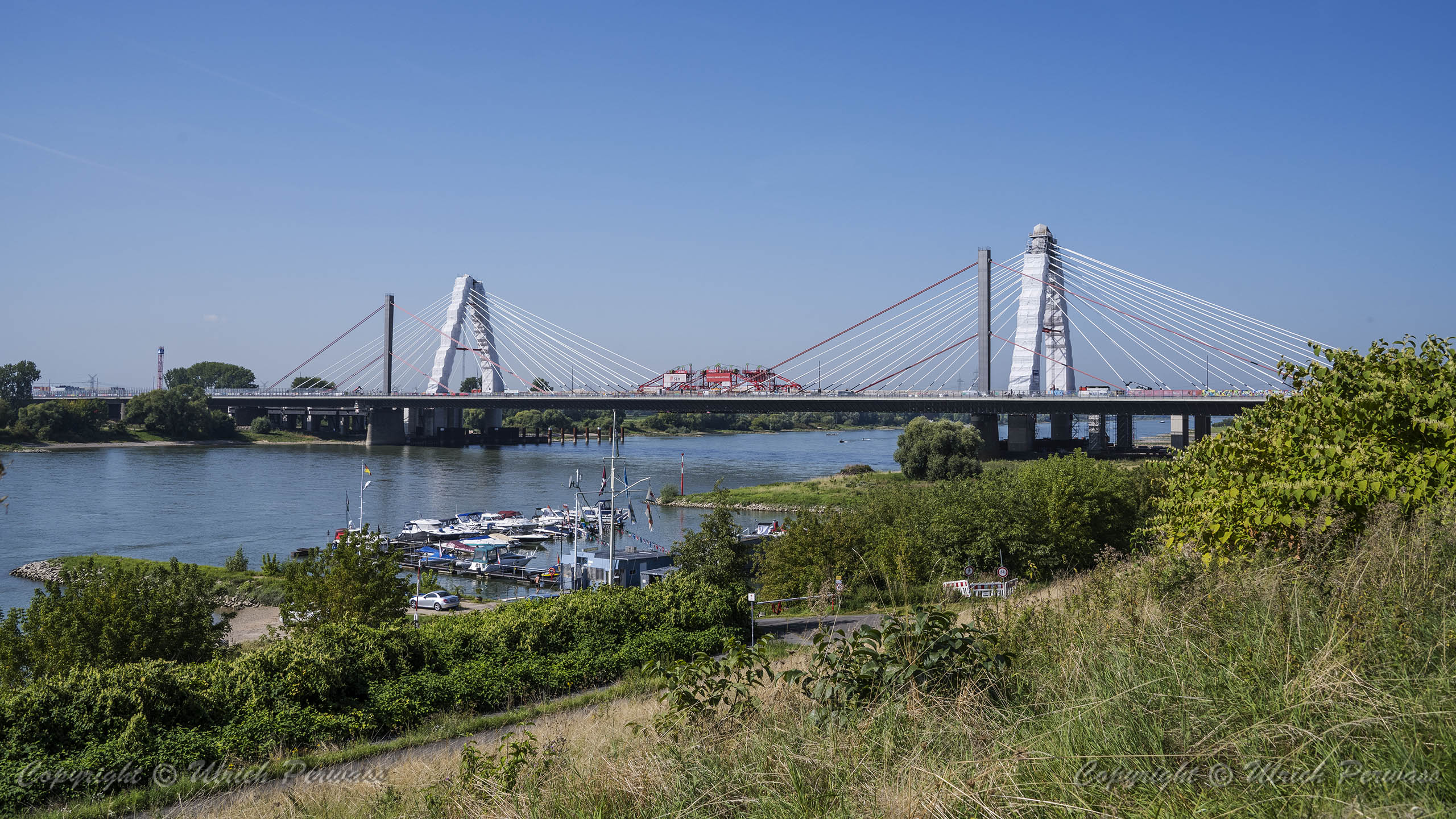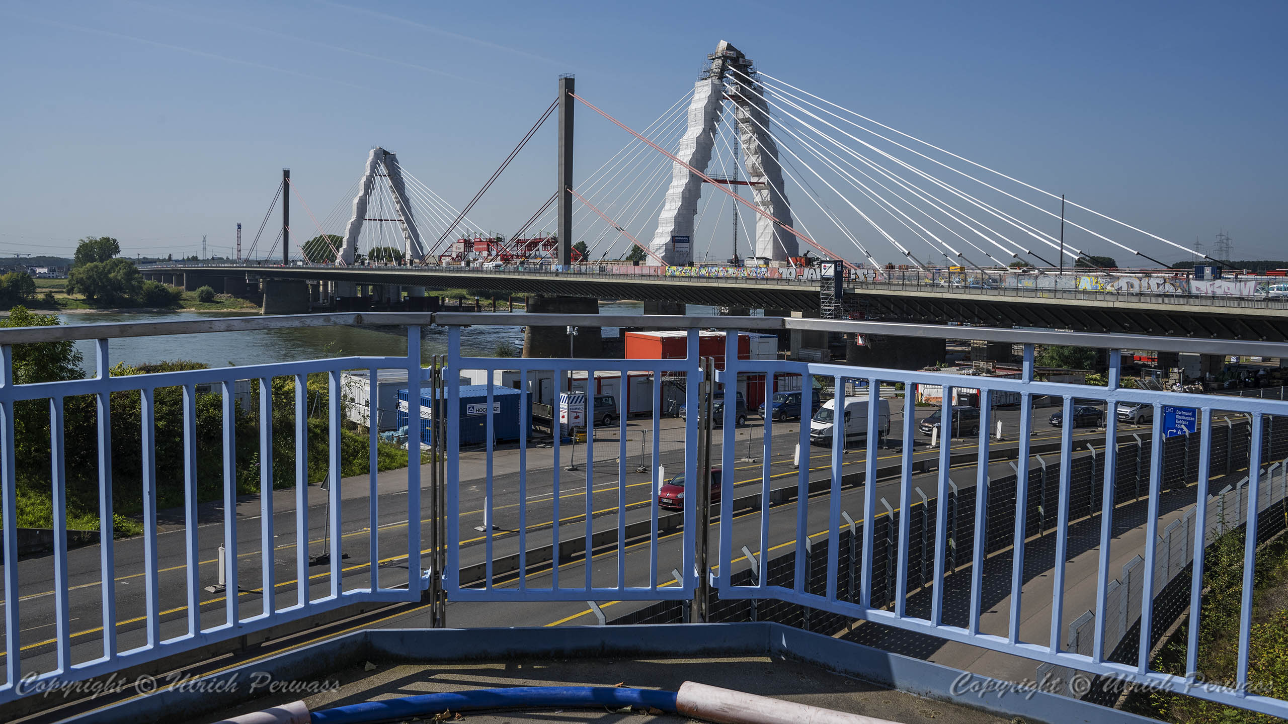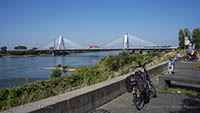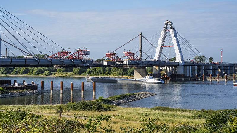 Am Dienstag, den 05.September 2023, wurden bis 17:34 Uhr die beiden letzten Stahlbauteile in die noch bestehende 17 Meter breite Lücke eingesetzt. Diese Meldung erreichte mich am Mittwoch und reizte mich natürlich zu einer neuen Fotosafari mit dem Fahrrad in Leverkusen. Am Samstag, den 9. September 2023, ging es bereits um 10 Uhr los. Vom Parkplatz an der Rheinallee 1 in Leverkusen fuhr ich wegen einer gesperrten Wupperbrücke über einen Feldweg an der linken Seite der Dhünn zur alten Wuppermündung und weiter zur Nordseite der A1-Brücke, wo ich die Baustelle möglichst gut fotografieren konnte.