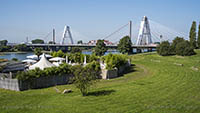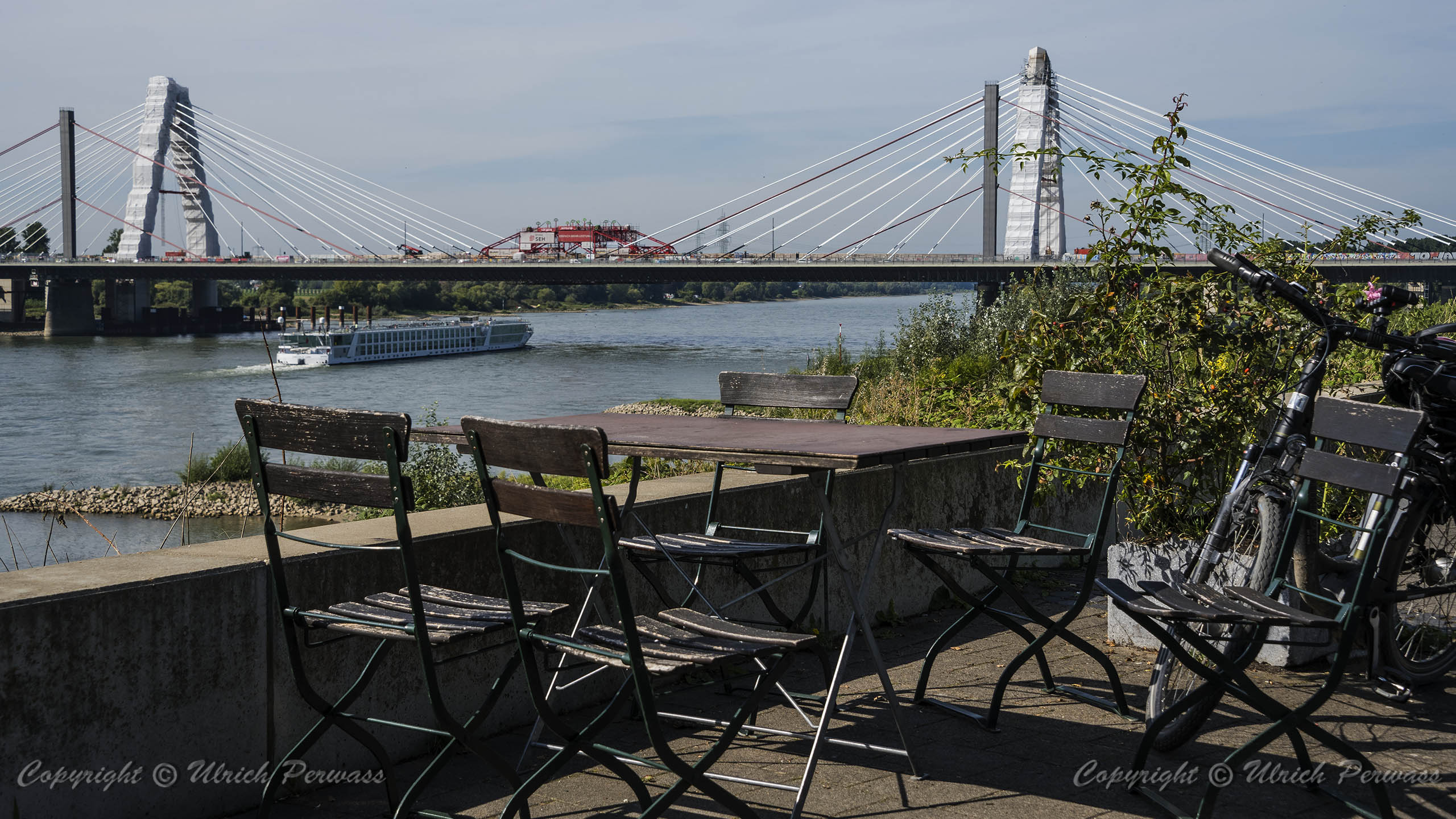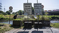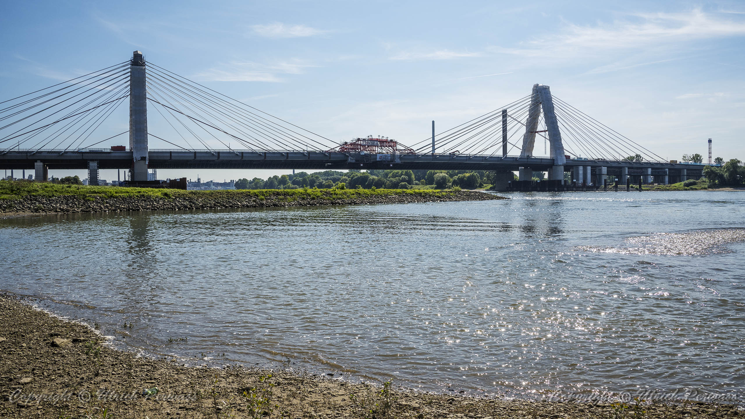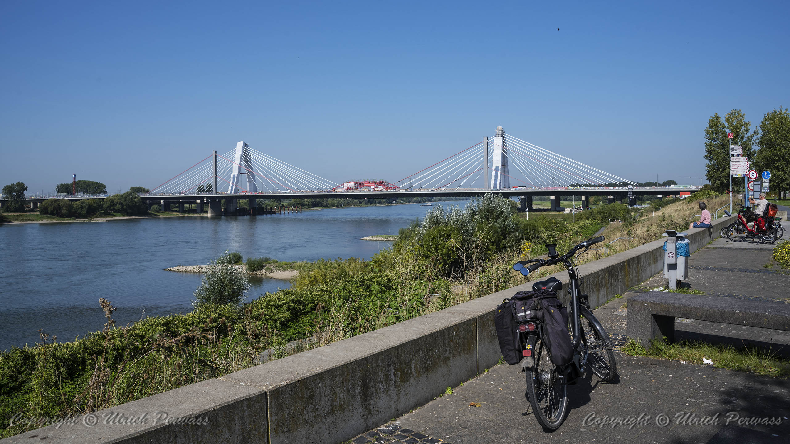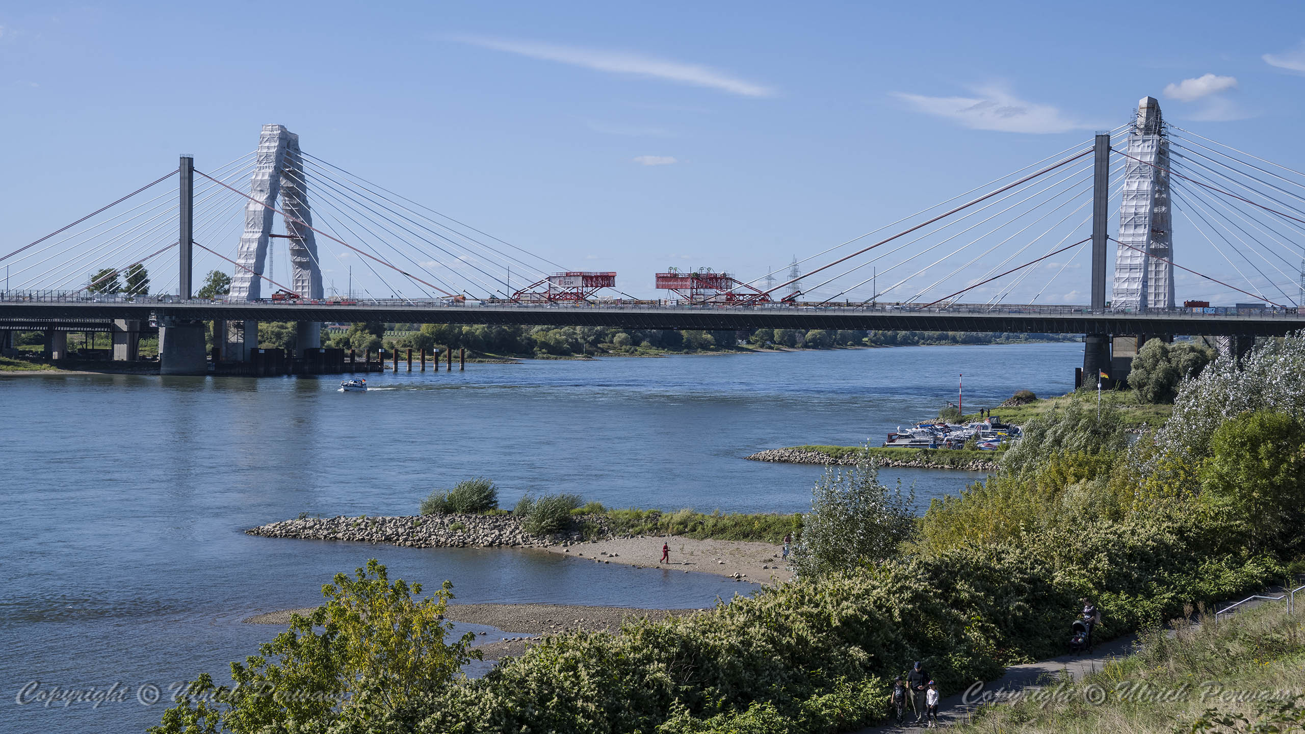 Am Dienstag, den 05.September 2023, wurden bis 17:34 Uhr die beiden letzten Stahlbauteile in die noch bestehende 17 Meter breite Lücke eingesetzt. Diese Meldung erreichte mich am Mittwoch und reizte mich natürlich zu einer neuen Fotosafari mit dem Fahrrad in Leverkusen. Am Samstag, den 9. September 2023, ging es bereits um 10 Uhr los. Vom Parkplatz an der Rheinallee 1 in Leverkusen fuhr ich wegen einer gesperrten Wupperbrücke über einen Feldweg an der linken Seite der Dhünn zur alten Wuppermündung und weiter zur Nordseite der A1-Brücke, wo ich die Baustelle möglichst gut fotografieren konnte.