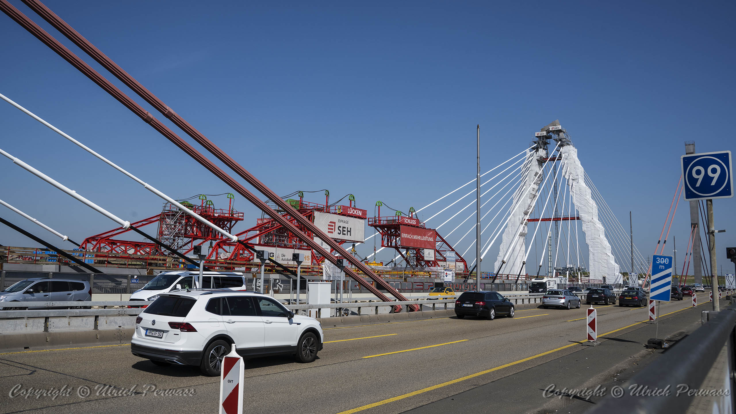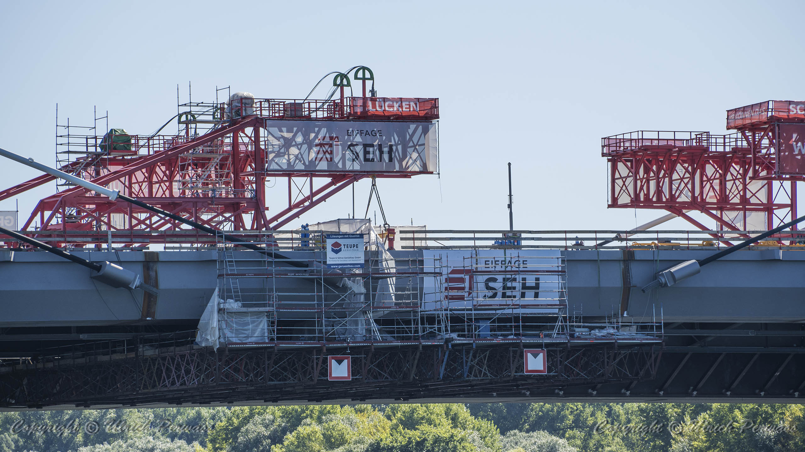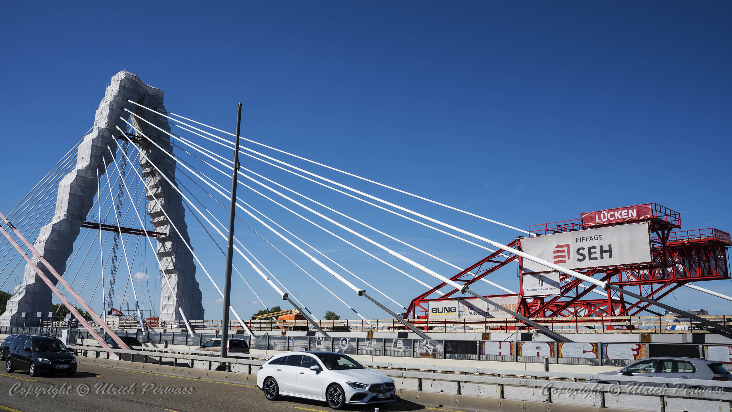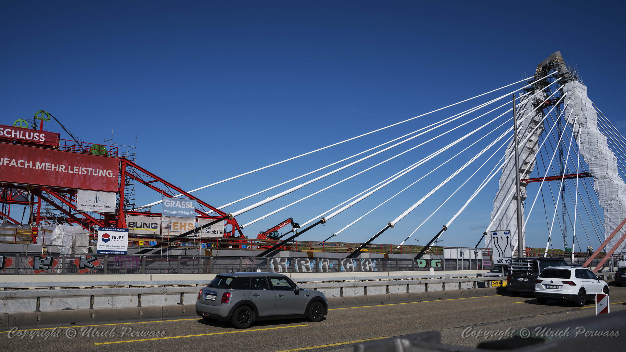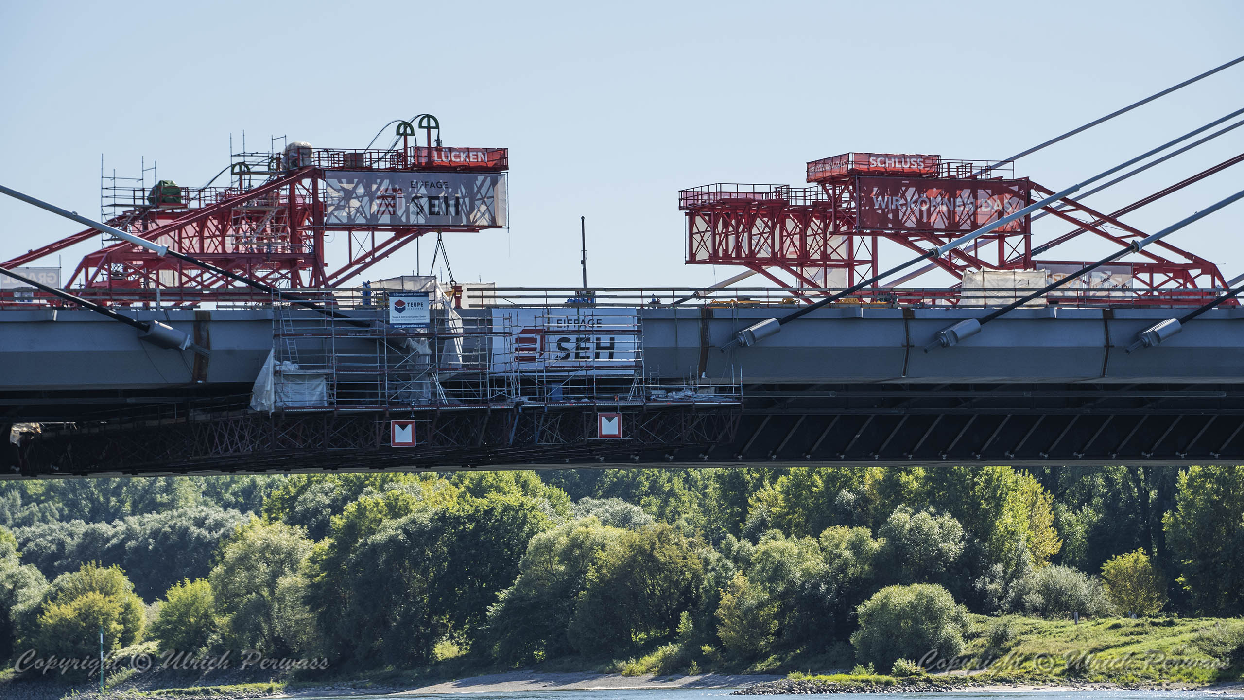 Eine Woche später am 16. September das Gleiche nochmals, um den Baufortschritt zu erkennen. Die letzten Schrägseile waren zwar eingezogen, aber zwischen den beiden Brückenteilen gab es noch immer einen kleinen Versatz, der wohl inzwischen behoben ist. Herzlichen Glückwunsch an alle Mitwirkenden!