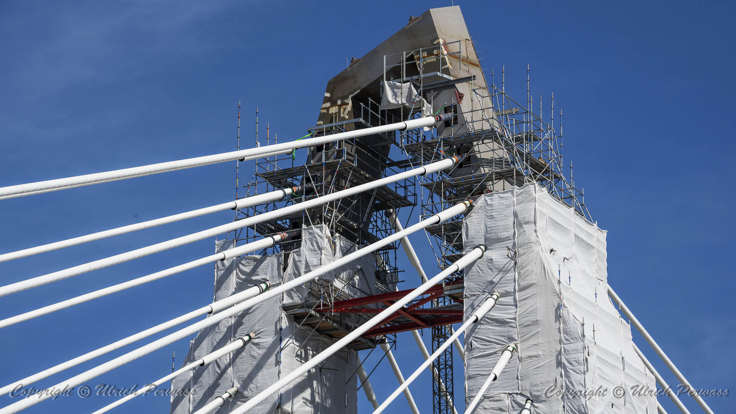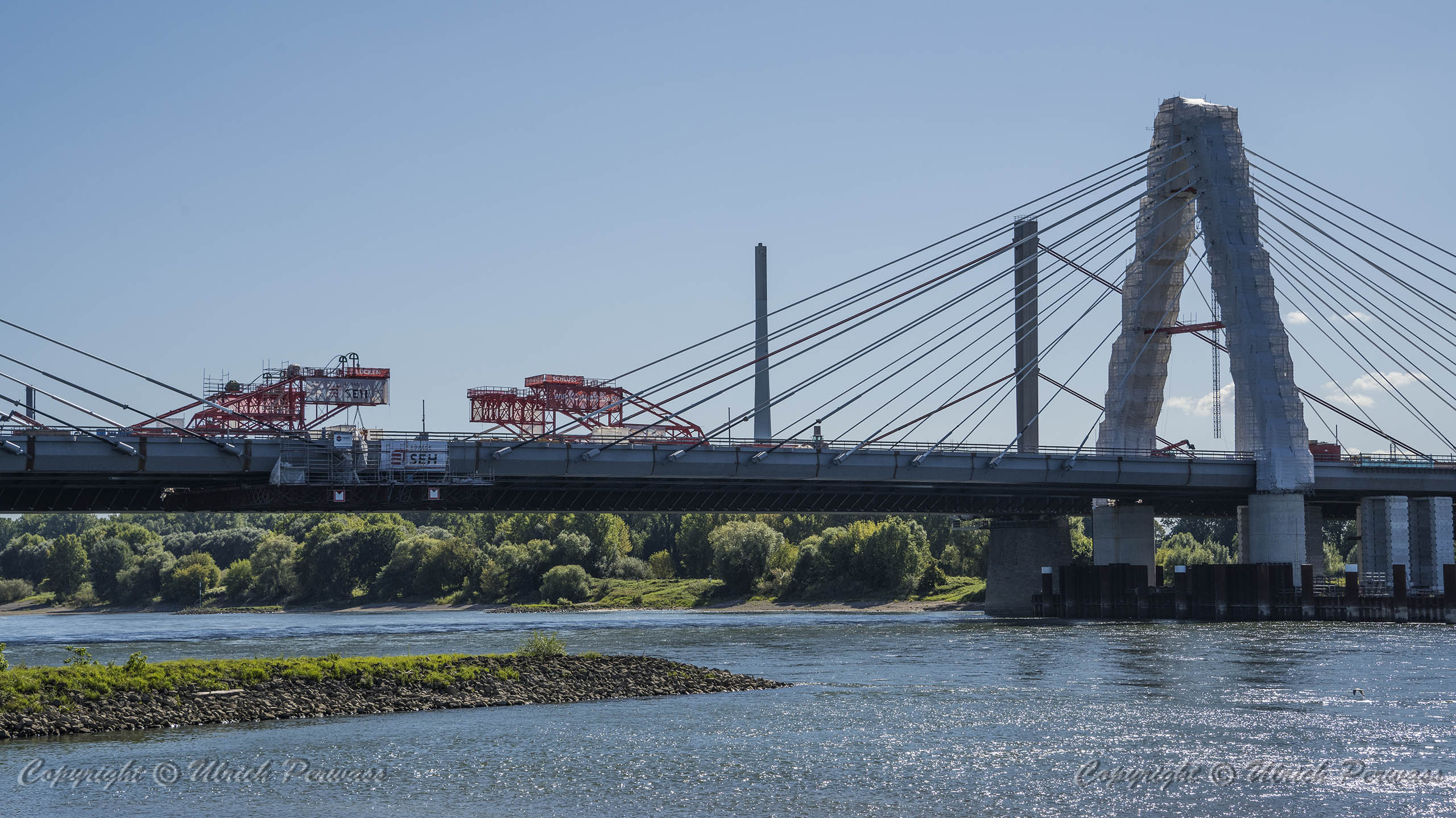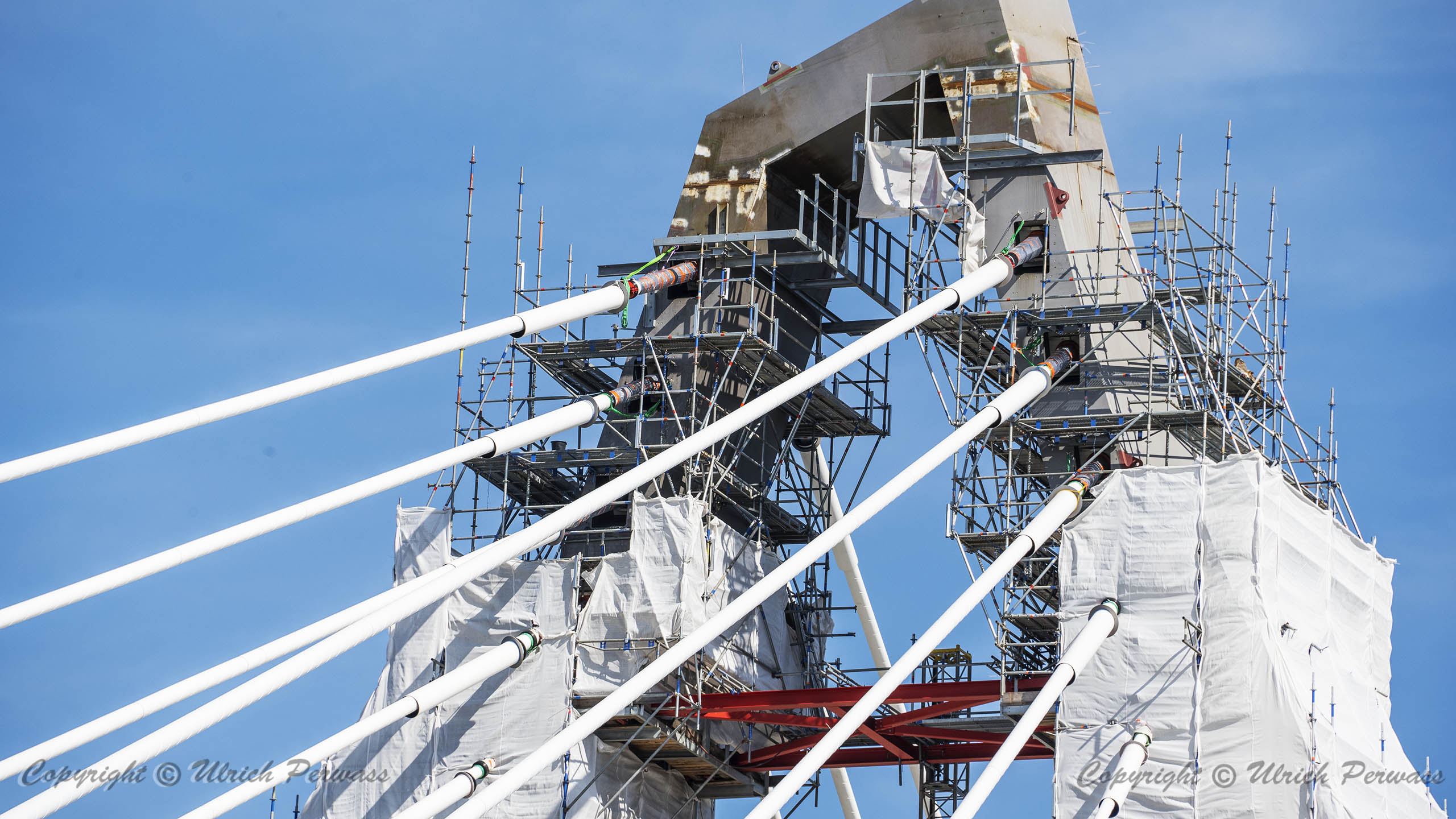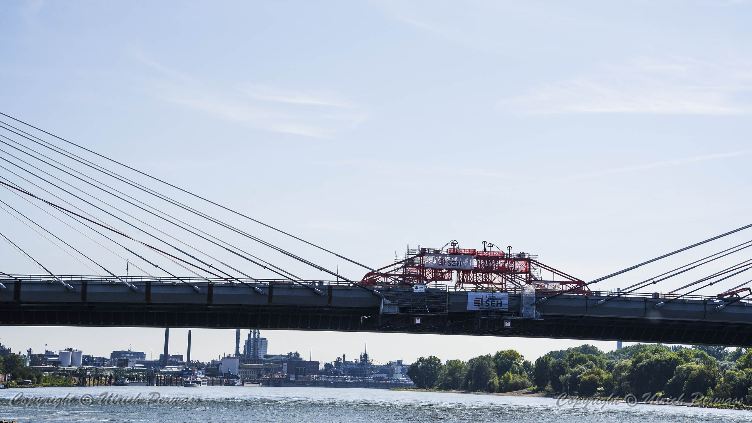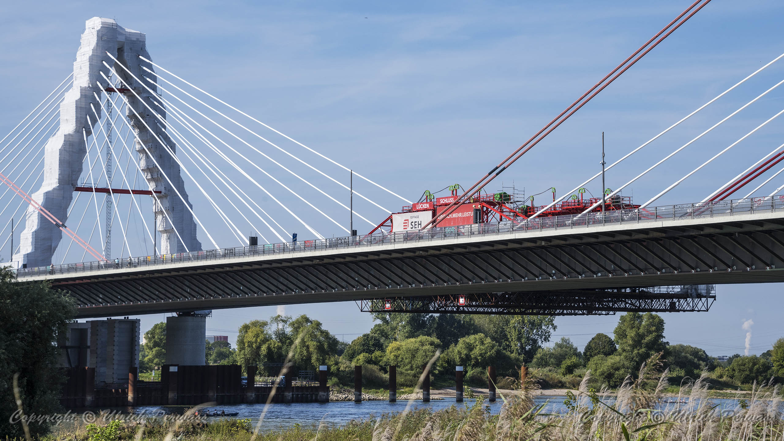 Eine Woche später am 16. September das Gleiche nochmals, um den Baufortschritt zu erkennen. Die letzten Schrägseile waren zwar eingezogen, aber zwischen den beiden Brückenteilen gab es noch immer einen kleinen Versatz, der wohl inzwischen behoben ist. Herzlichen Glückwunsch an alle Mitwirkenden!