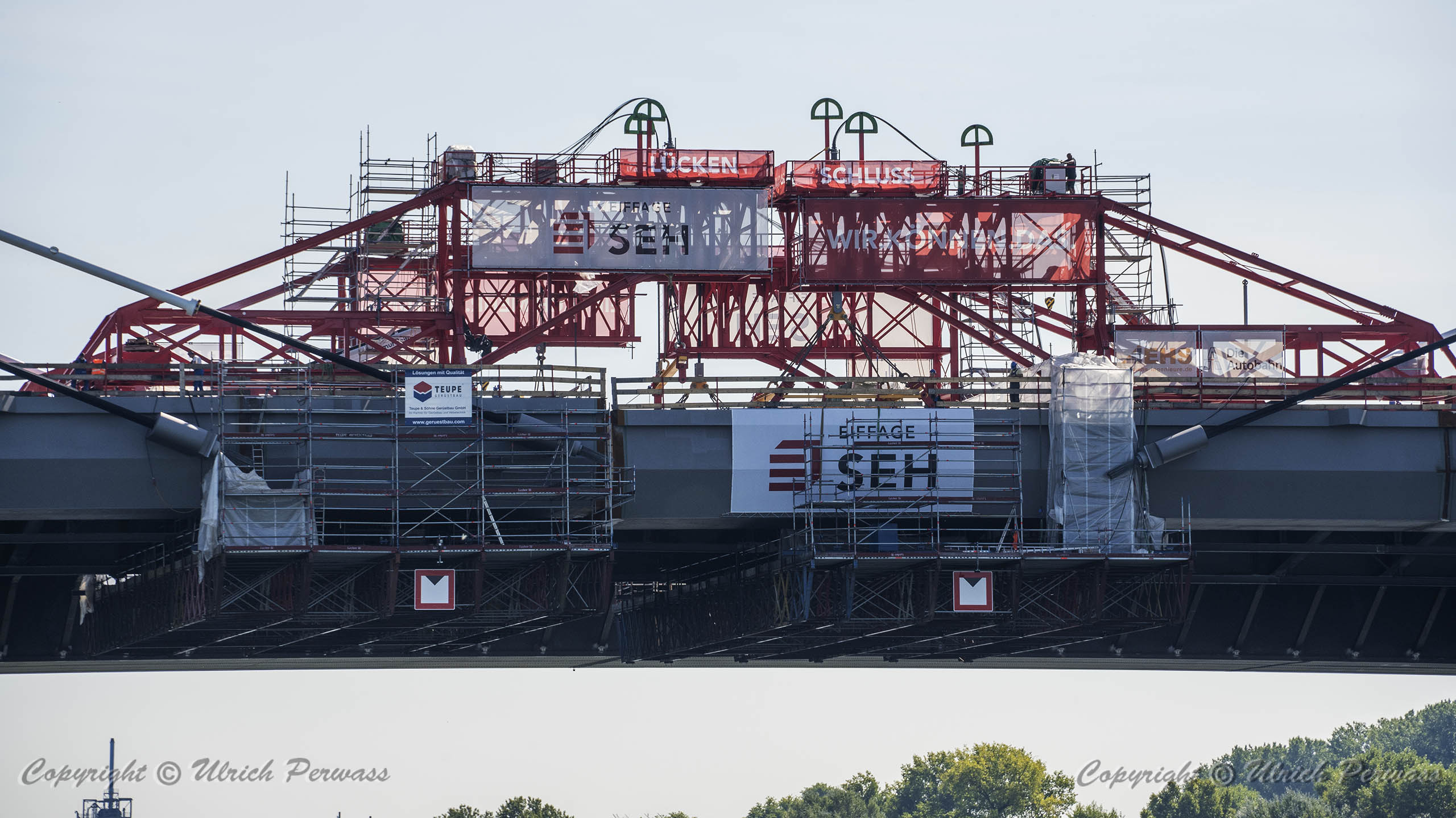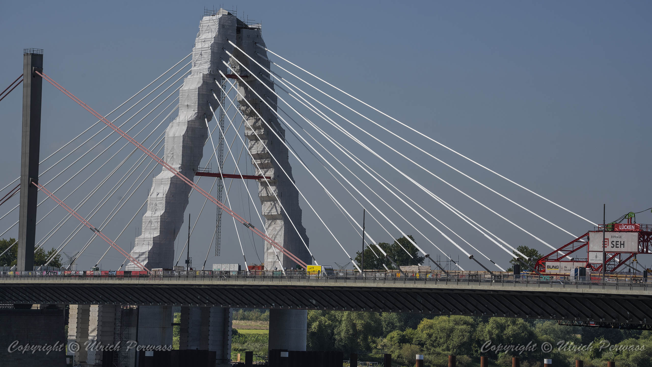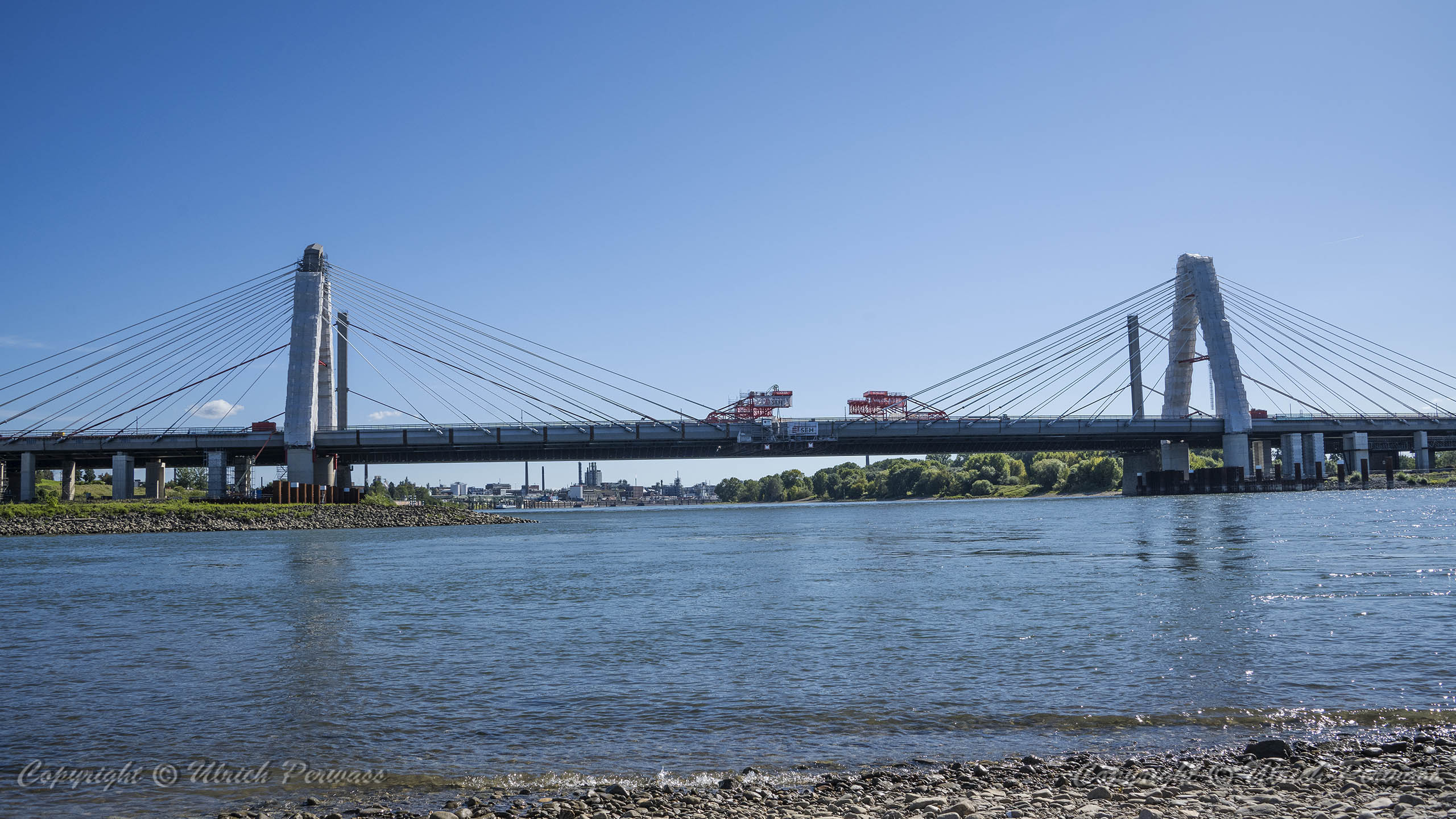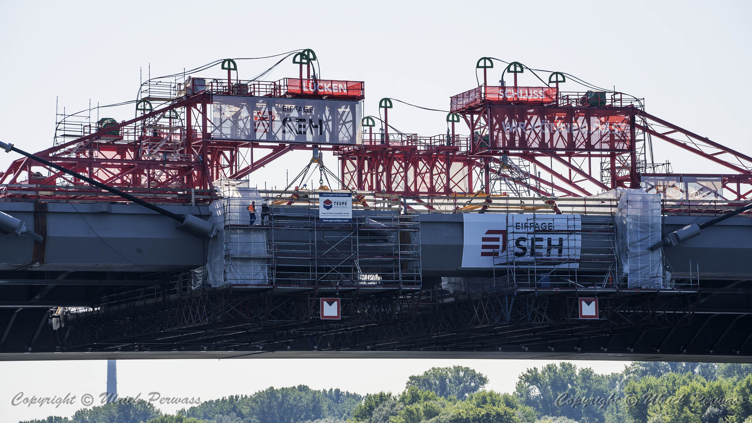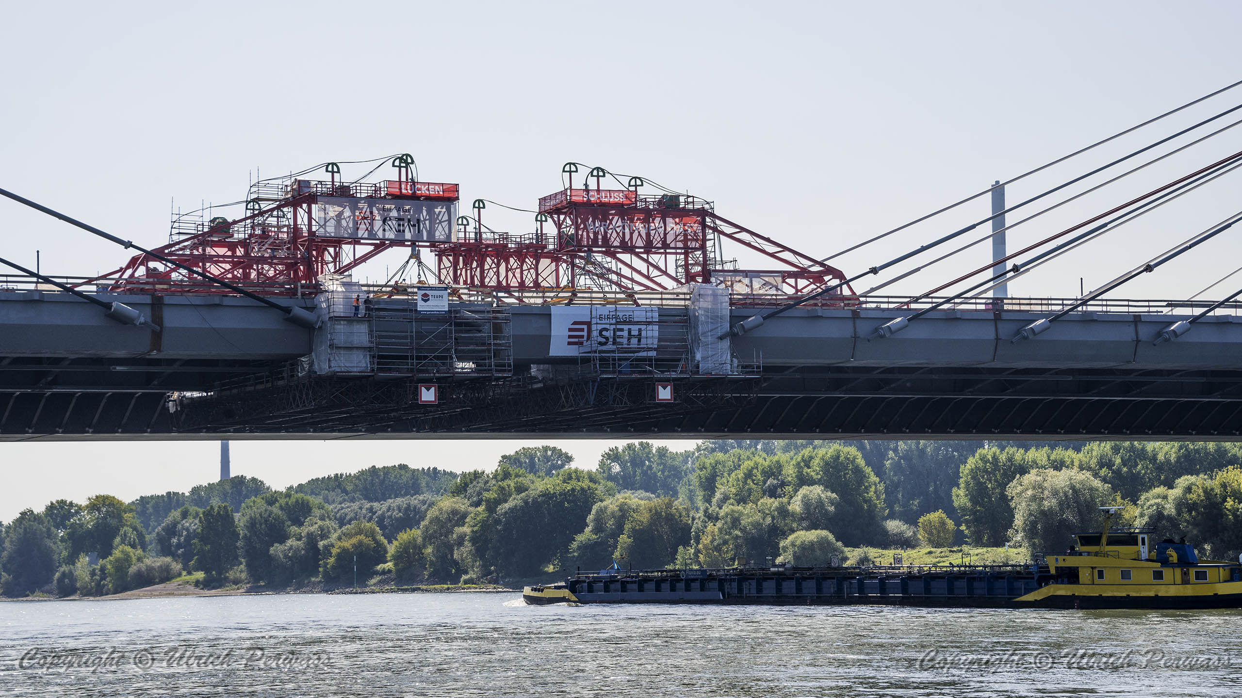Eine Woche später am 16. September das Gleiche nochmals, um den Baufortschritt zu erkennen. Die letzten Schrägseile waren zwar eingezogen, aber zwischen den beiden Brückenteilen gab es noch immer einen kleinen Versatz, der wohl inzwischen behoben ist. Herzlichen Glückwunsch an alle Mitwirkenden!