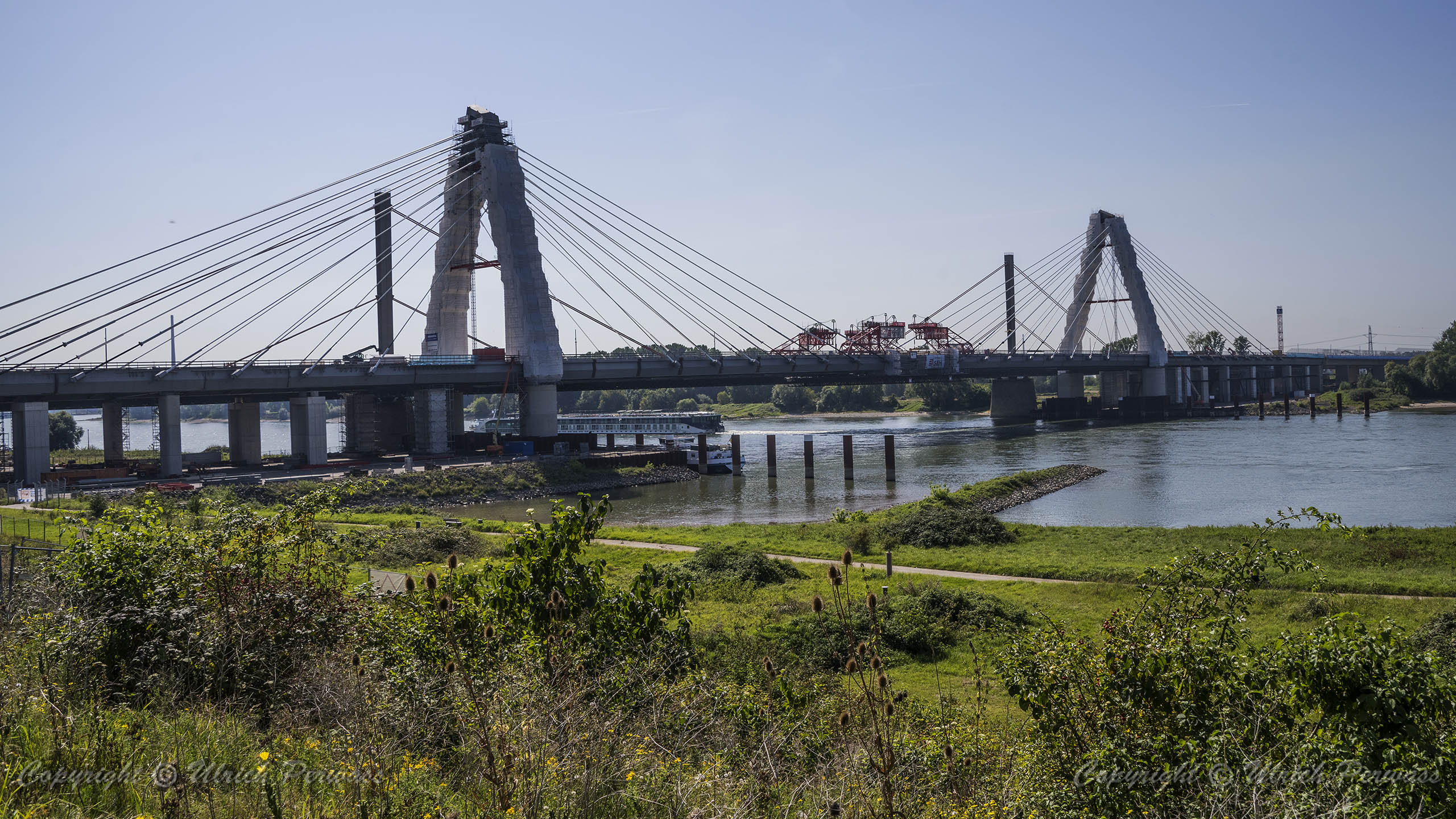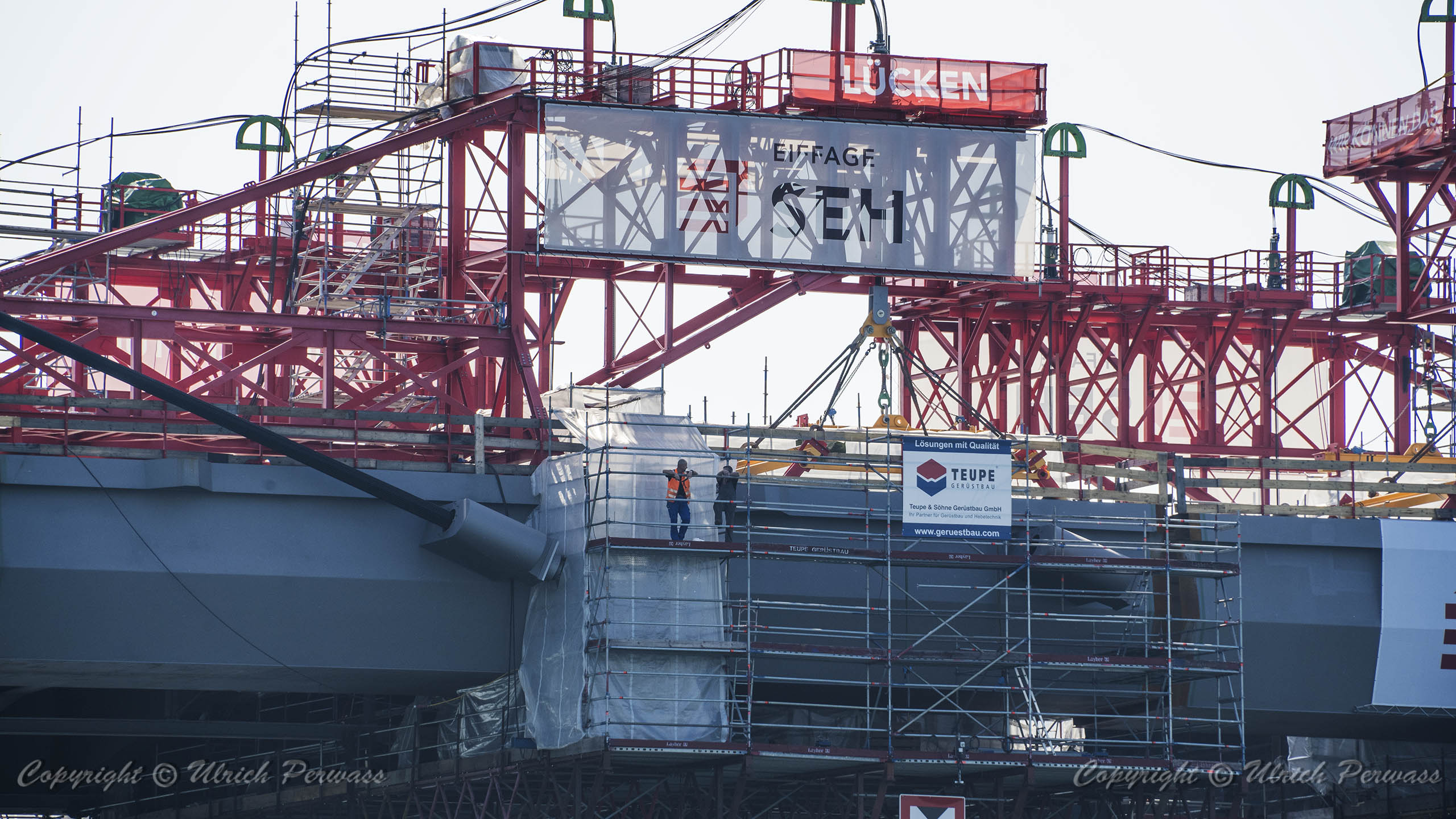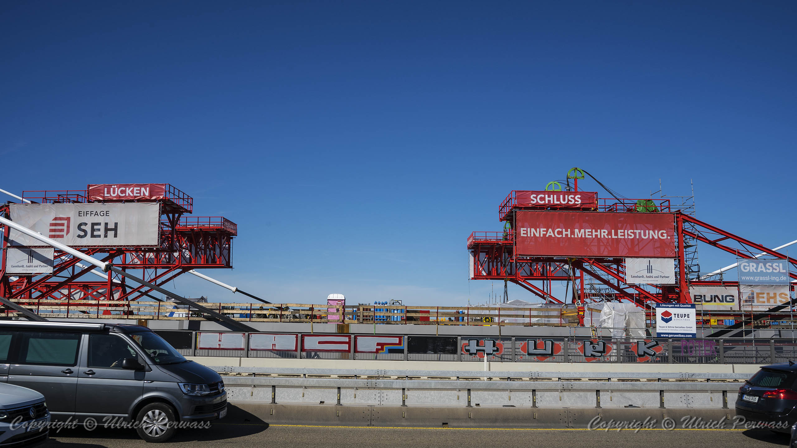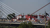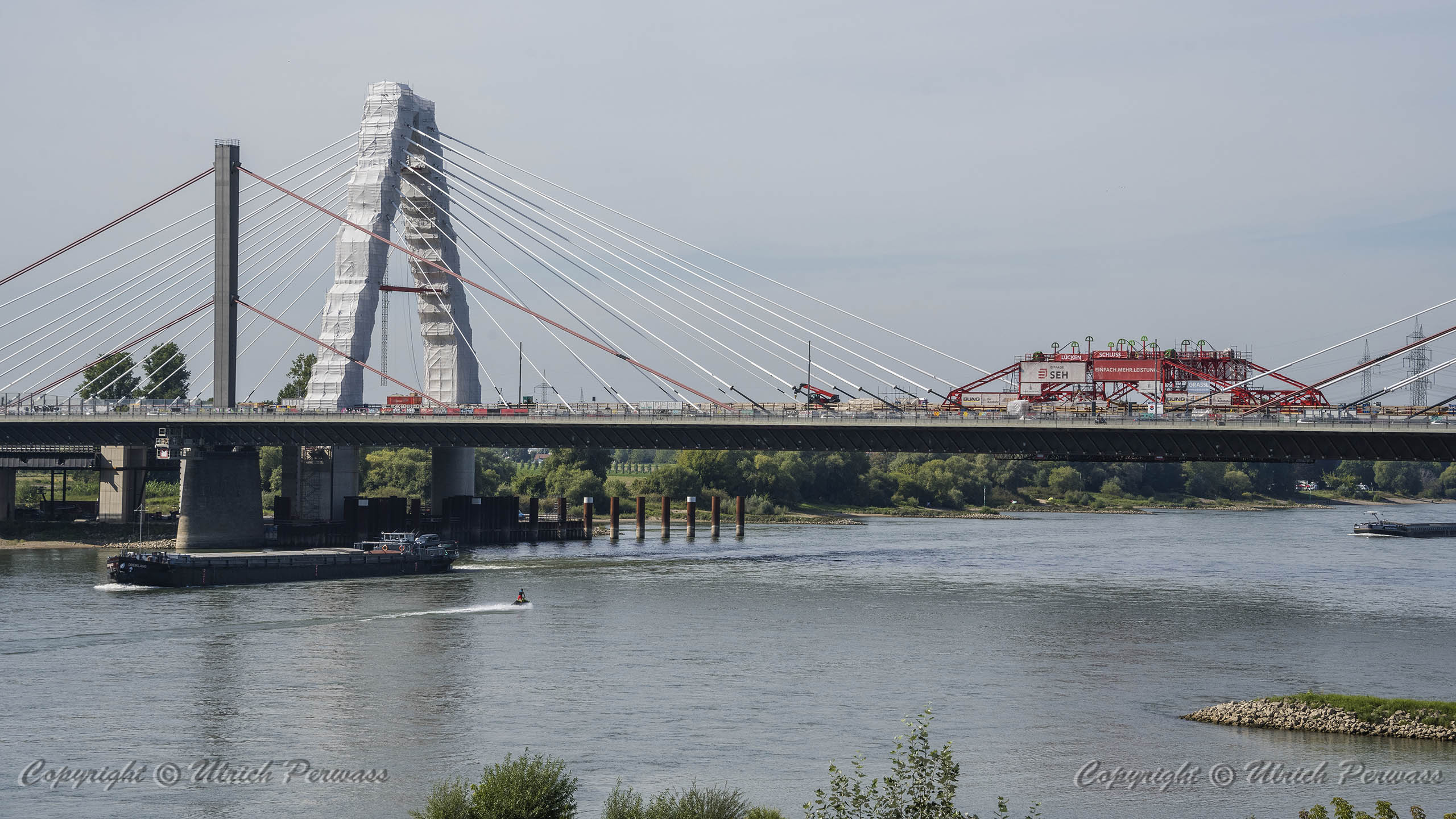 Eine Woche später am 16. September das Gleiche nochmals, um den Baufortschritt zu erkennen. Die letzten Schrägseile waren zwar eingezogen, aber zwischen den beiden Brückenteilen gab es noch immer einen kleinen Versatz, der wohl inzwischen behoben ist. Herzlichen Glückwunsch an alle Mitwirkenden!