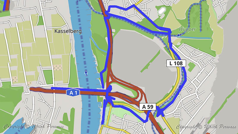 Einen direkten Weg vom Radweg der neuen Brücke zum nördlich gelegenen Rheindorf gibt es nach wie vor nicht, da der Abriß der alten Brücke dies verhindert. Deshalb hier der Screenshot vom 10 Kilometer langen Umweg an der Dhünn entlang. Gute Fahrt! |