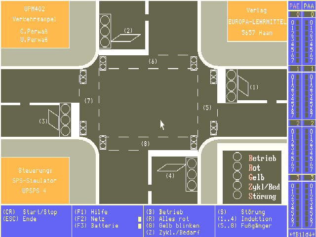 Eine Straßenkreuzung mit Fahrzeug- und Fußgängerampeln, sowie Induktionsschleifen und Fußgängertastern kann individuell von einer selbstgeschriebenen Anweisungsliste gesteuert werden.